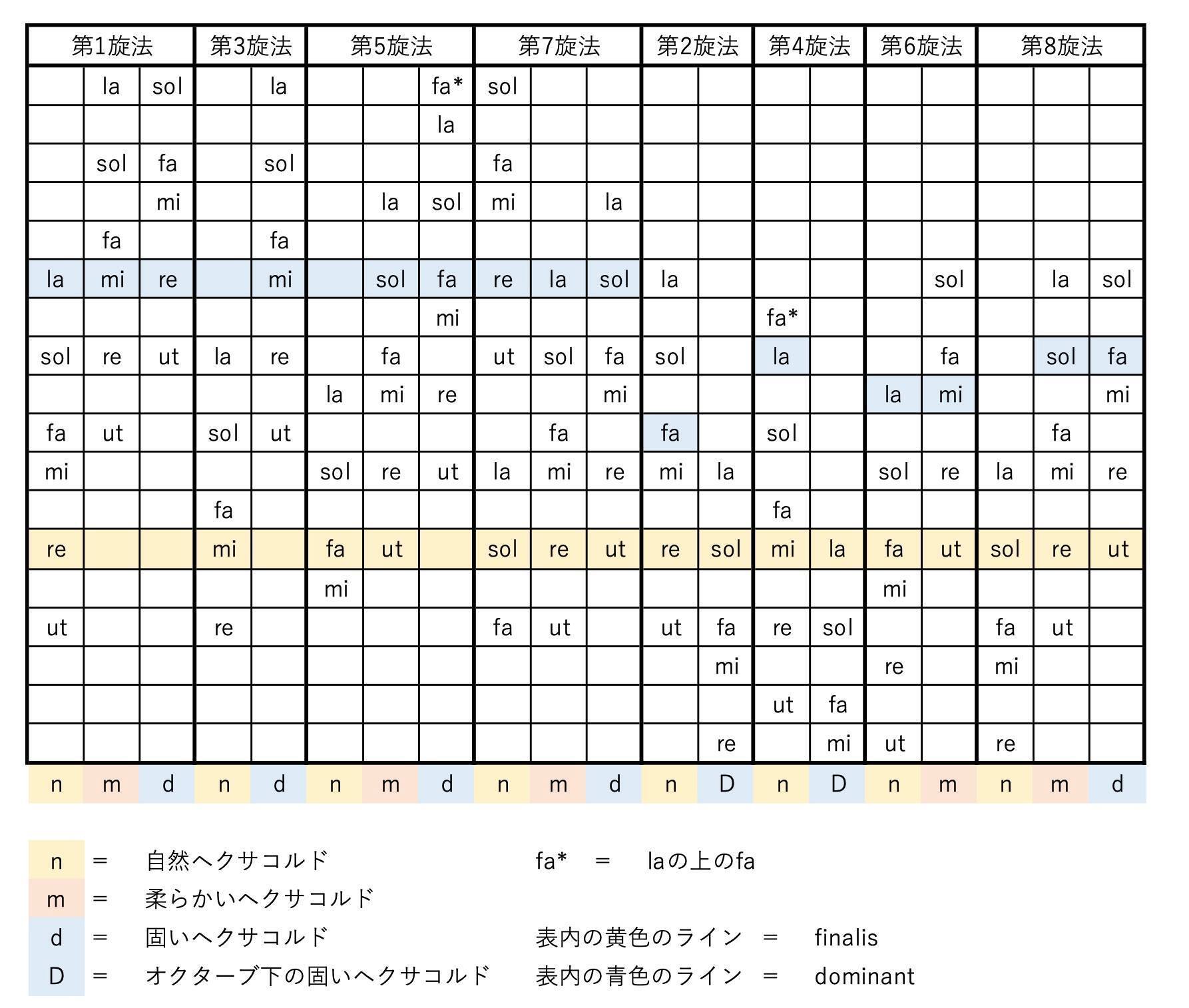 「旋法」はグレゴリオ聖歌を分類する方法として考え出され、その後の音楽はその概念のもと育まれていきました。その頃用いられていた「階名」(音程を示すシラブル)は「ヘクサコルド」と呼ばれる6音の階名で、現在用いられている「ヘプタコルド」とはコンセプトの異なるものでした。