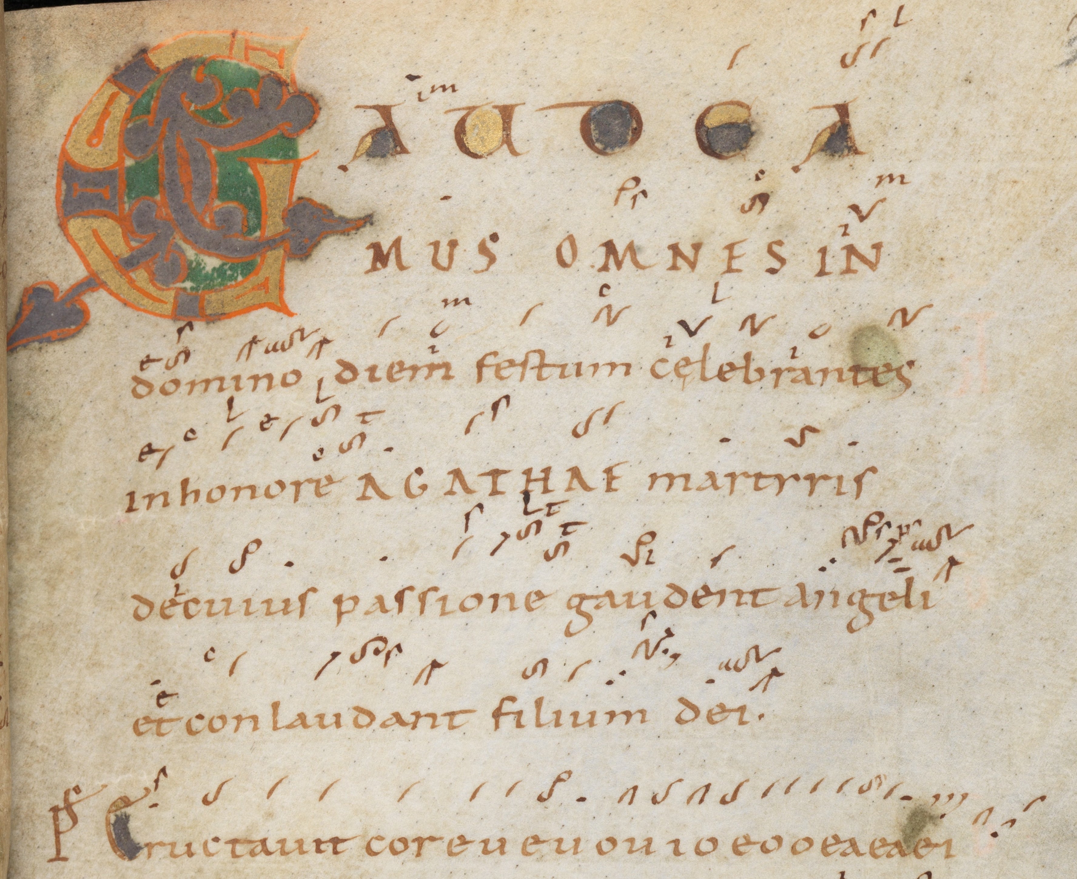 また、10世紀頃に書かれた写本にある、グレゴリオ聖歌の歌唱法を示した「古ネウマ」という記譜法があります。古ネウマが示す歌唱法は現在では失われ、どのように当時歌われていたのかわからない部分がかなりあります。私たちはこの「古ネウマ」を手がかりに、「失伝した西洋の歌唱法」の再創造を行っています。その際、インドを始めとした世界の古典音楽の現在の有り様からも大いにインスピレーションを受けています。