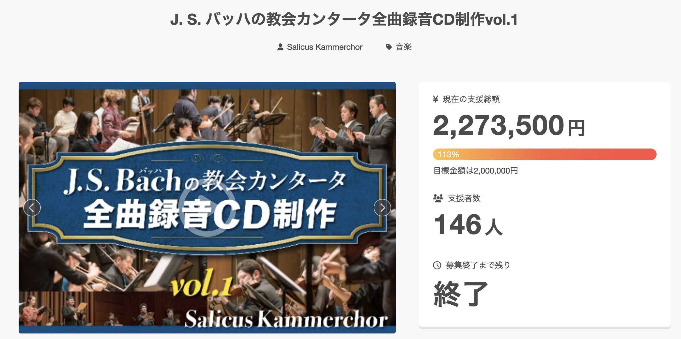 Salicus Kammerchorの櫻井元希です。2024年に皆様からいただいた温かいご支援により、J. S. バッハの教会カンタータ録音プロジェクト第1弾を完成させることができました。146名の支援者の皆様、本当にありがとうございました。今回はその第2弾、BWV84, 139, 168, 187の4曲を収録いたします。