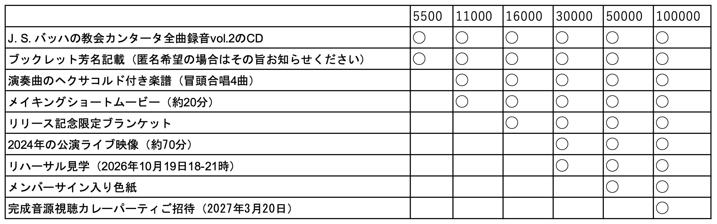 ご支援いただいた皆様には、完成したCD、動画コンテンツ、コンサートへのご招待など、プロジェクトへの想いをお返しする形でご用意させていただきます。金額帯に応じて、複数のリターンプランをご用意しておりますので、ご自身のご支援スタイルに合わせてお選びください。