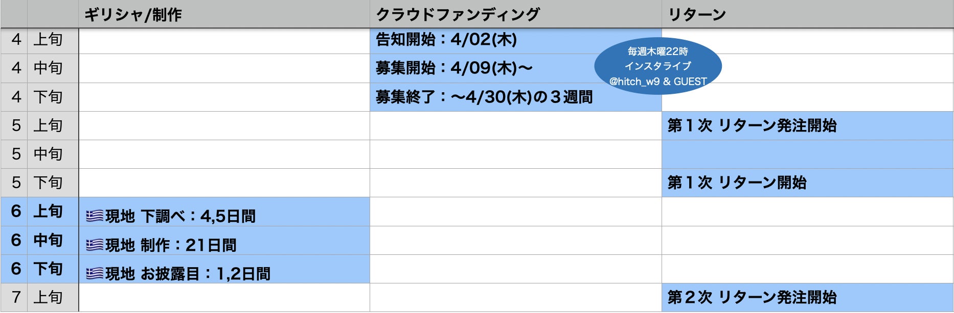 6月中はギリシャに滞在し、①羽衣伝説の調査、②壁画制作、③お披露目会を行います。ご支援のリターンはその前後に行い、壁画制作を伴わないものは事前の第1次リターンとして、伴うものは事後の第2次リターンとして迅速に実行いたします。