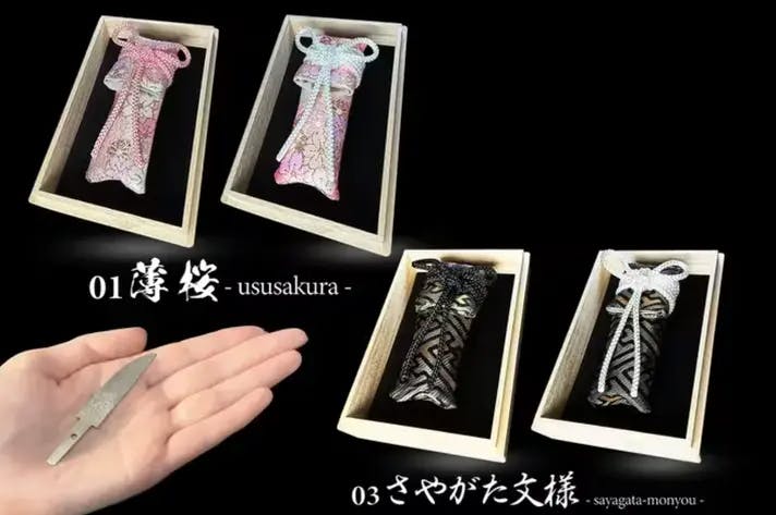 今回の⽬⽟作品です!今までよりもさらに⼩さく、持ち運びやすい⼩サイズ。⼿のひらや財布の中にもすっぽり収まり、いつでもどこでもお守り⼑を⾝につけることができます。