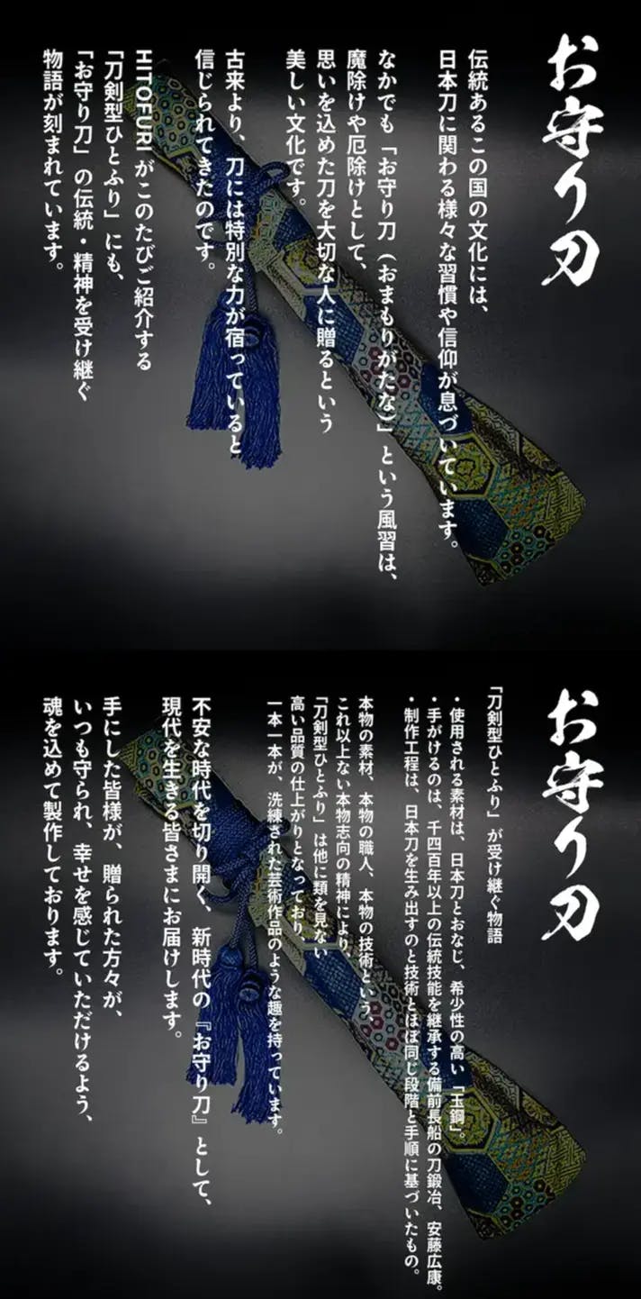 「御守型ひとふり」は、刀が武具としての役割を終えた現代の生活のなかにも、 私たちに歴史ある文化・誇らしき伝統を思い起こさせ、 心に安らぎと調和をもたらしてくれることでしょう。