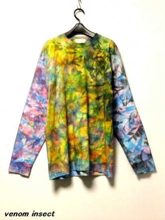 新しい試みとしてツイッターでロングTシャツを染色をしながら、変化の過程をライブツイートしました。画像はその後の工程を経て完成したものです。 本日夜10時頃から、染色の過程をvenom insectのTwitterアカウントからライブツイートいたします是非、ご覧ください。