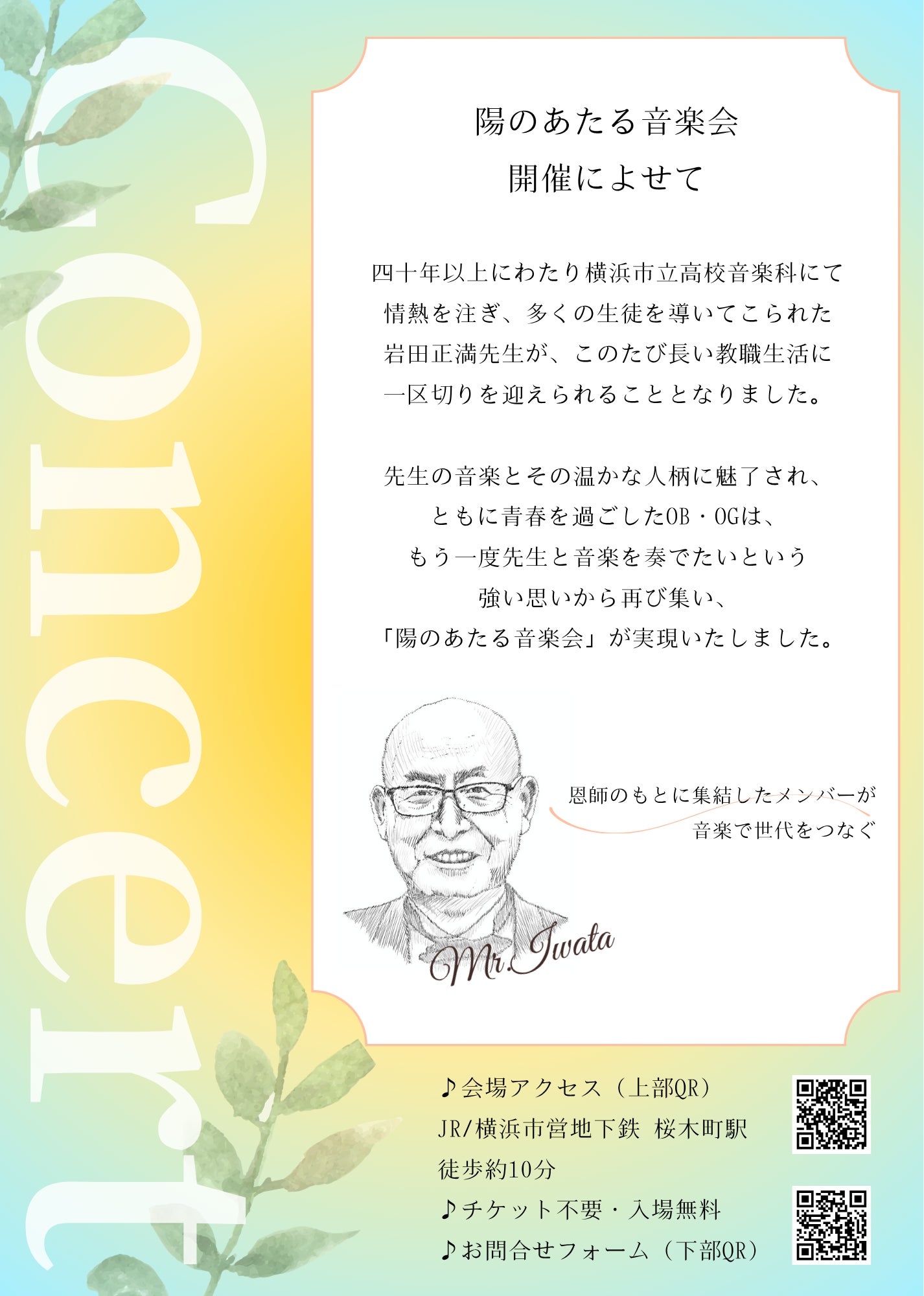 概要文に掲載した背景から、もう一度先生と音楽を奏でたいというOB・OG皆さんの思いから、先生が歴任された各校出身のOB・OGを中心に出演する「陽のあたる音楽会」を開催することになりました。