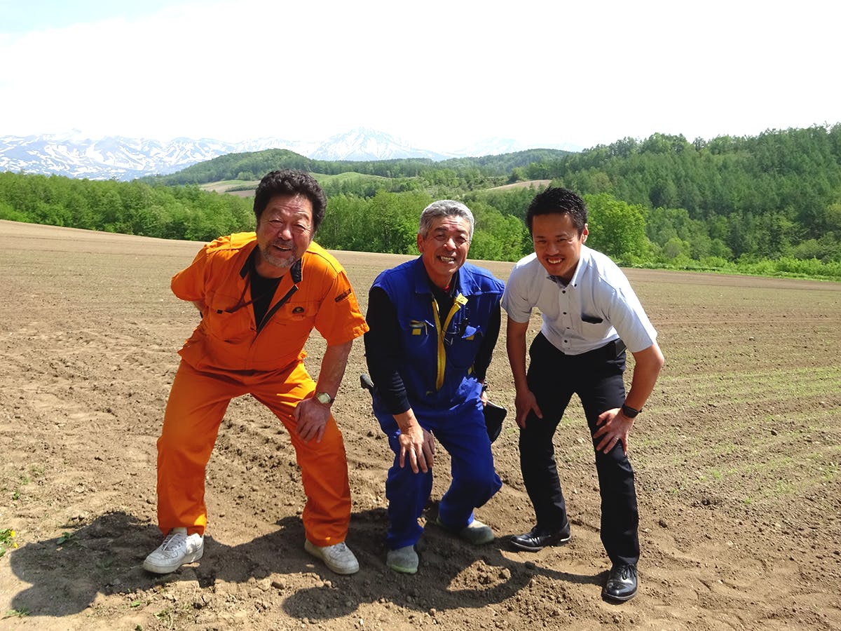 左・中央:北海道の生産者さん 右:社長のコータロー