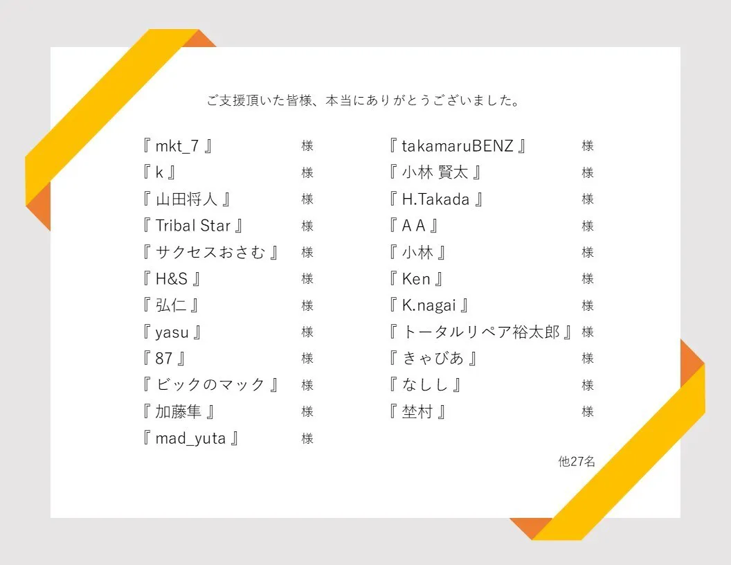 リターンで【お名前掲載】を、お選び頂いた皆様の