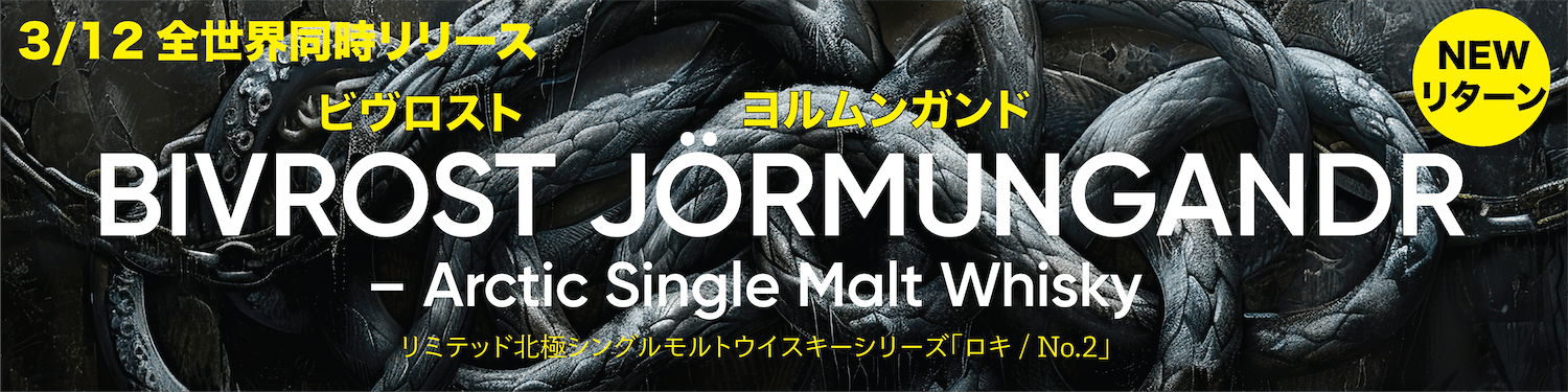 世界を包み込むようにトグロを巻く巨大な蛇「ヨルムンガンド」と名付けられたウイスキーは、フレンチワイン樽がフルーティーな果実味とほどよいグリップを与え、完成樽として使われたクレームブリュレのような風味をもたらすメープルシロップ樽が贅沢で奥深い甘さを演出する一方で、北極で育った大麦のスパイスが輪郭とバランスを生み出す1本。