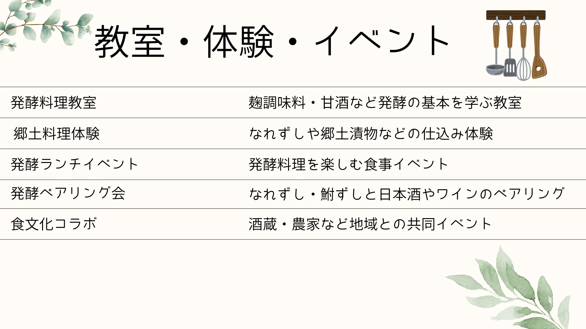 発酵ランチ会やプレオープンなど、実際に足を運び、食と交流を楽しめる機会をご用意しています。