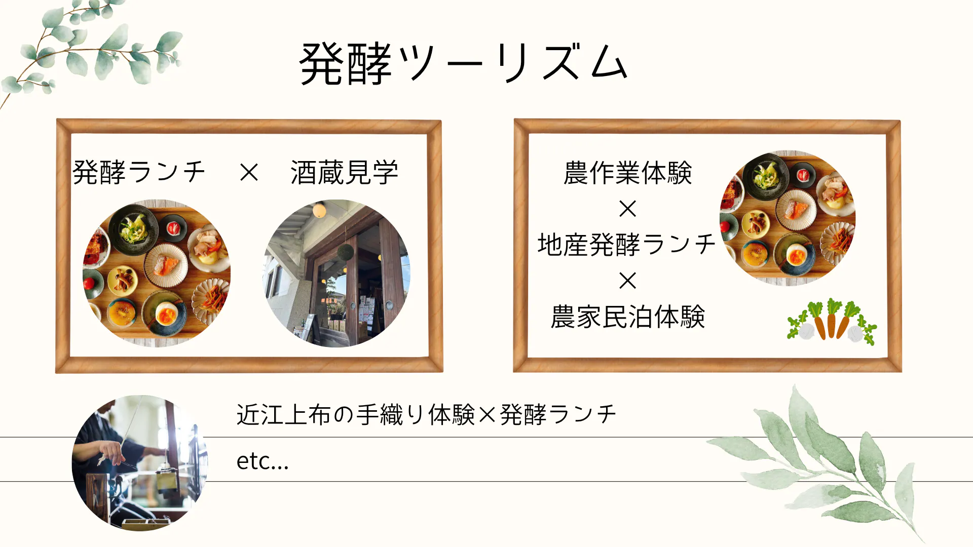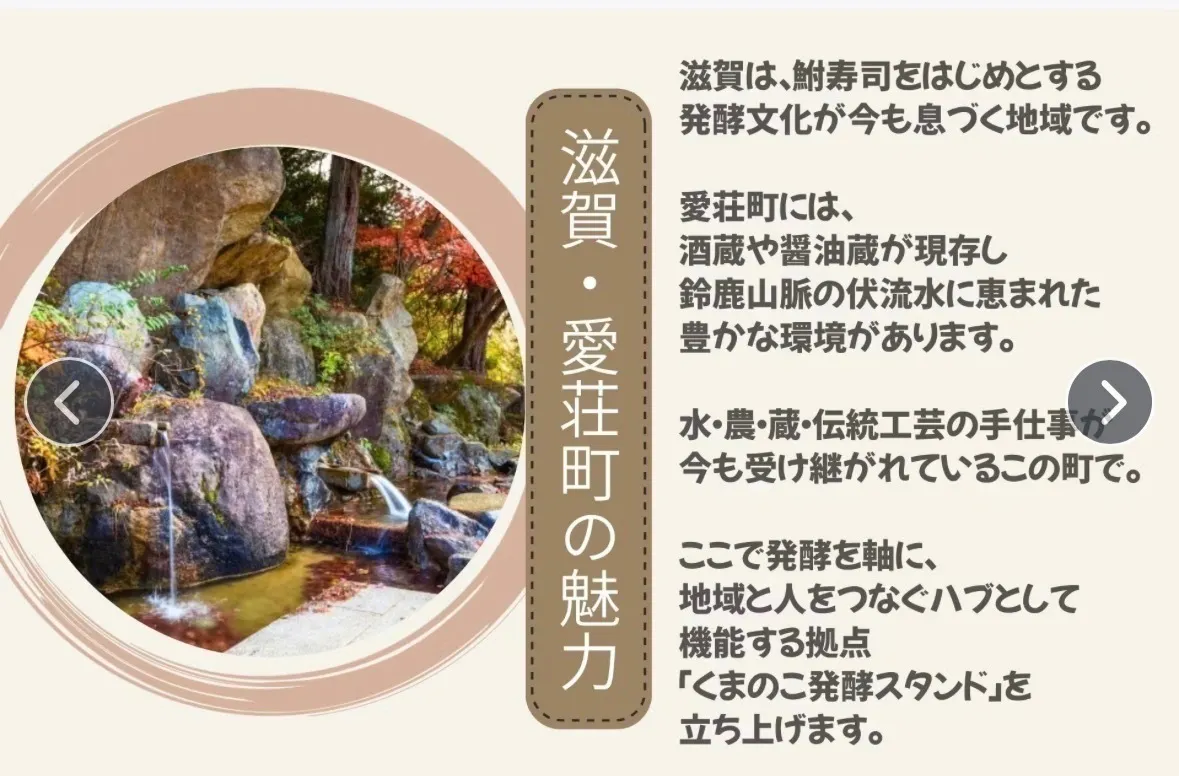 くまのこ発酵スタンドを起点に、愛荘町の農家、酒蔵、工芸などの地域資源と連携し、地域を巡る体験を生み出します。