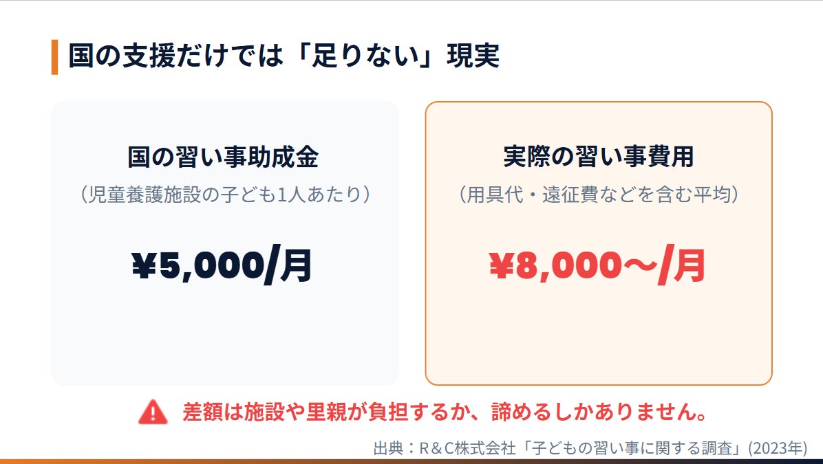 国の支援だけでは足りず、残りの3,000円〜5,000円は施設や里親が負担しているのが現実です。
