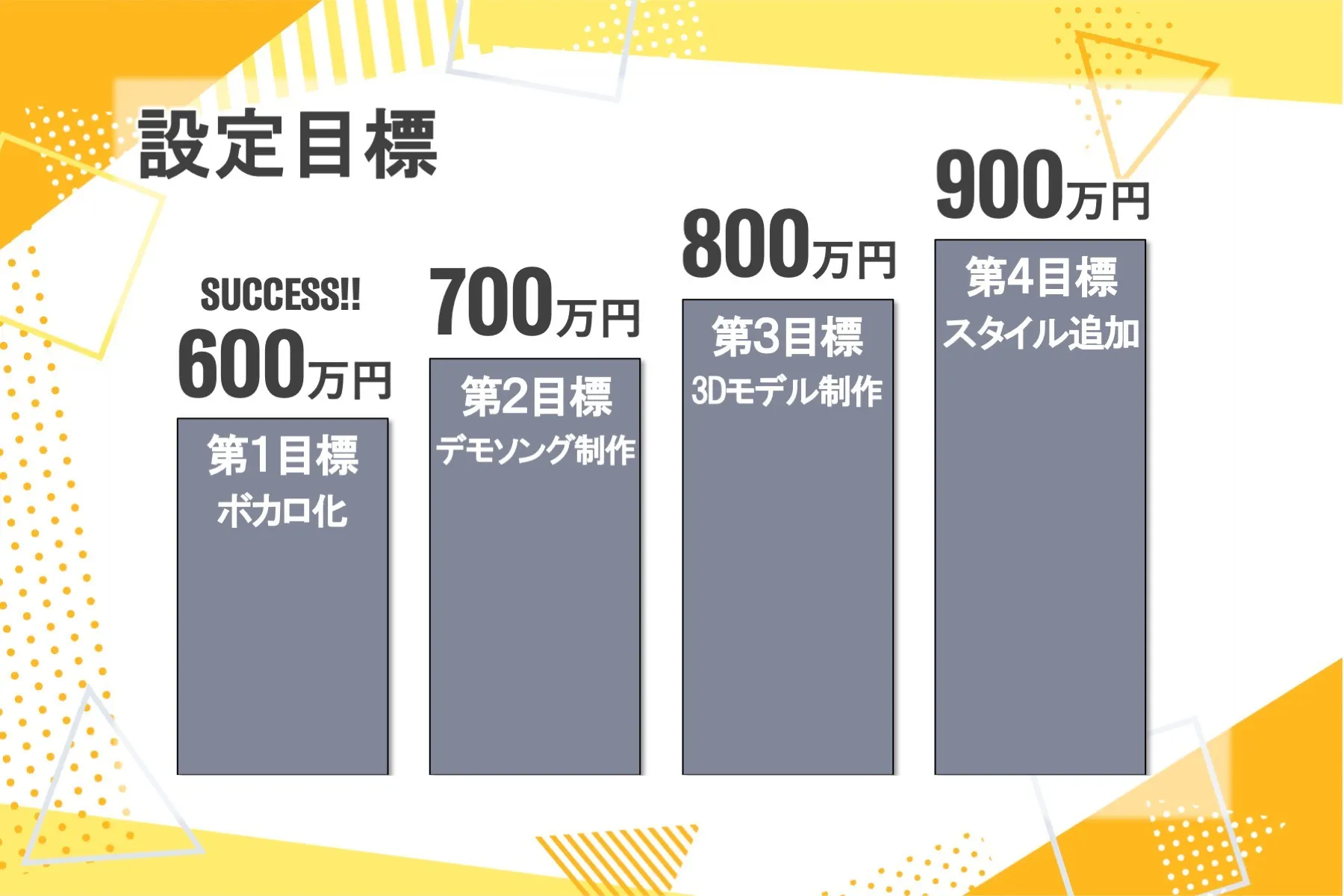 Success!! 第1目標 600万円:「VOCALOIDボイスバンク化」VOCALOID:AIによるボイスバンク化を目指します。