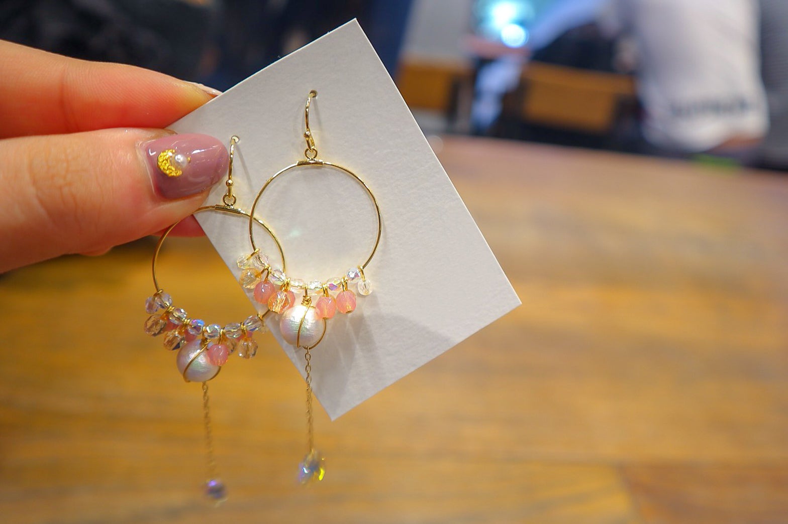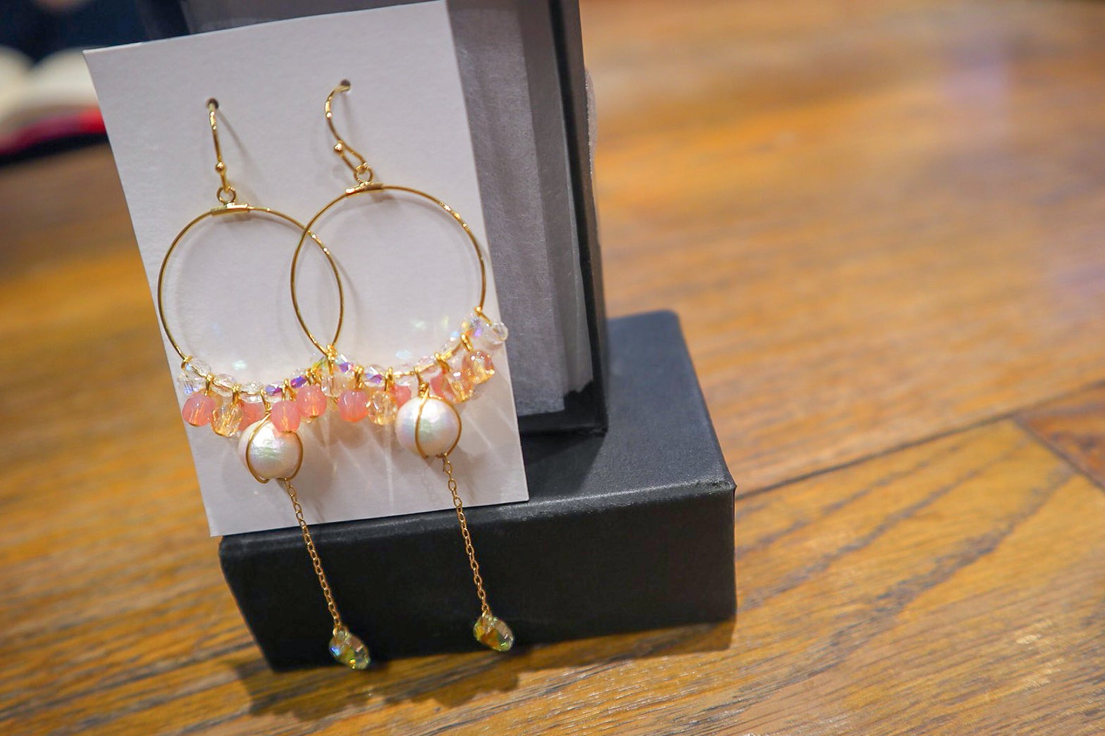 梨花のように白く艶のあるパール、ゆるみな。さんの原点である「‘‘桃’’ビール」のピンク、梨の瑞々しさを感じさせる透きとおった黄色。そして、幾度もこぼしてきた涙型のクリスタル。ベースパーツには、『梨花一心』のビールを思い出させるゴールドのみを使用。
