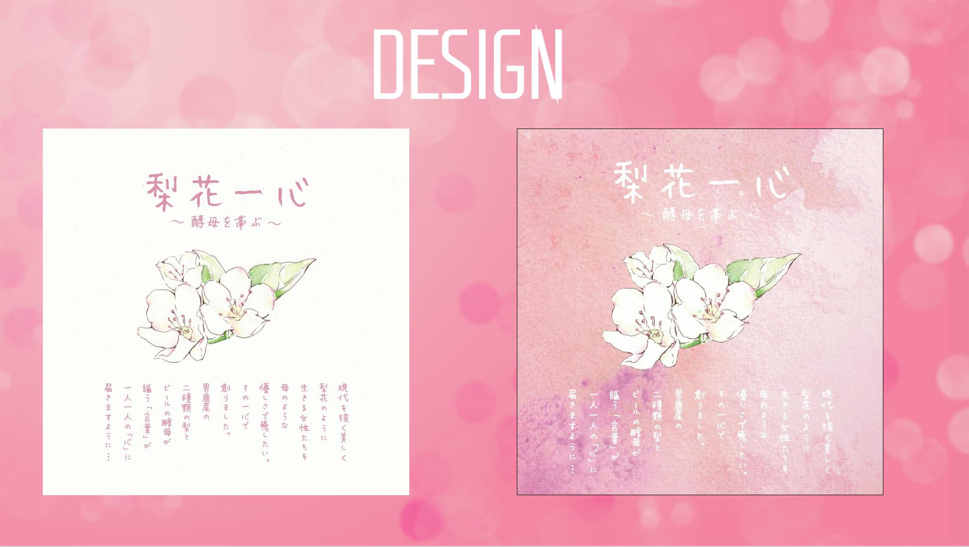 優しさが伝わるような梨の花のイラストと、やわらかい雰囲気の字体、そしてラベルは和紙を使って日本らしさを演出します。