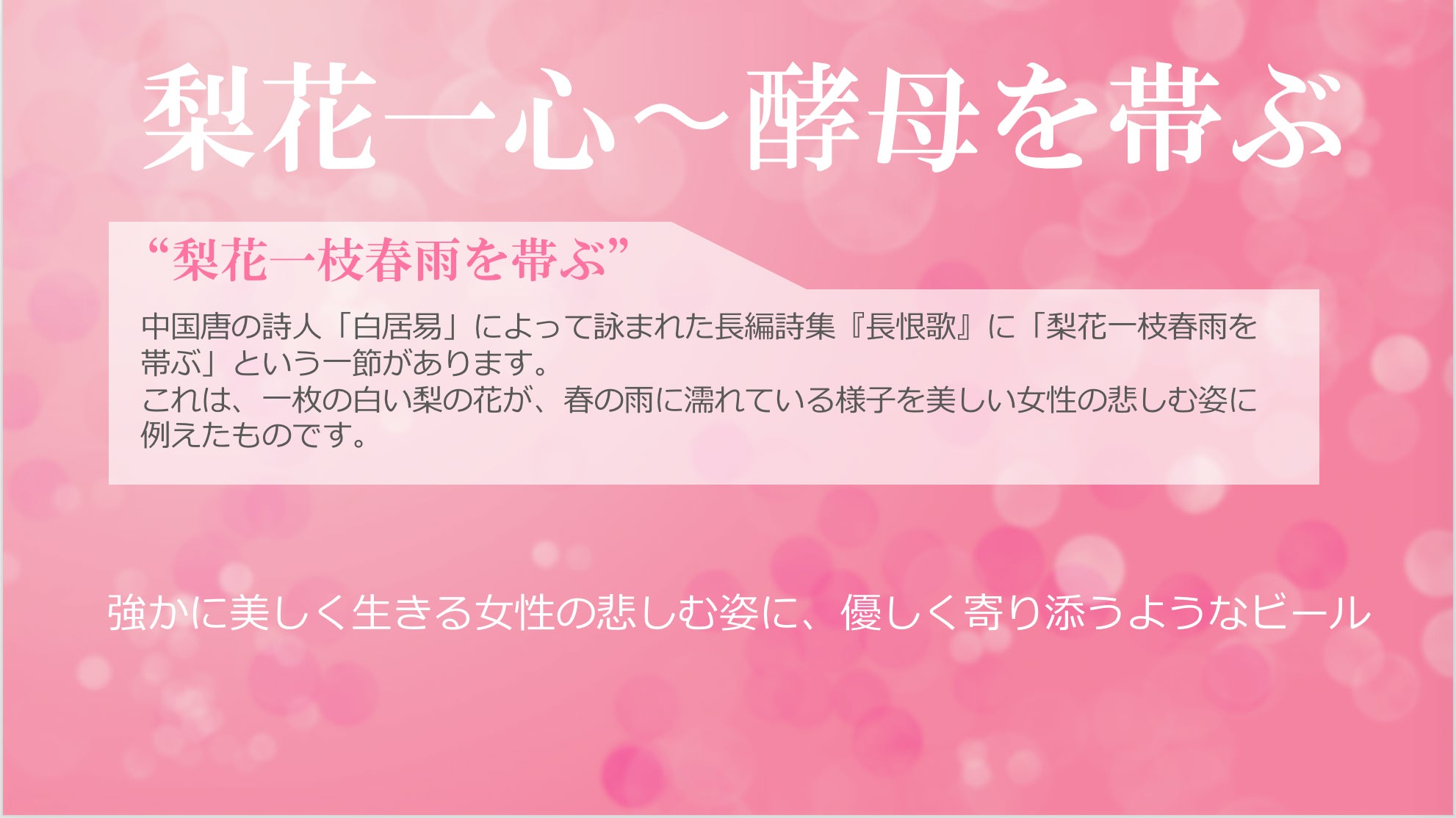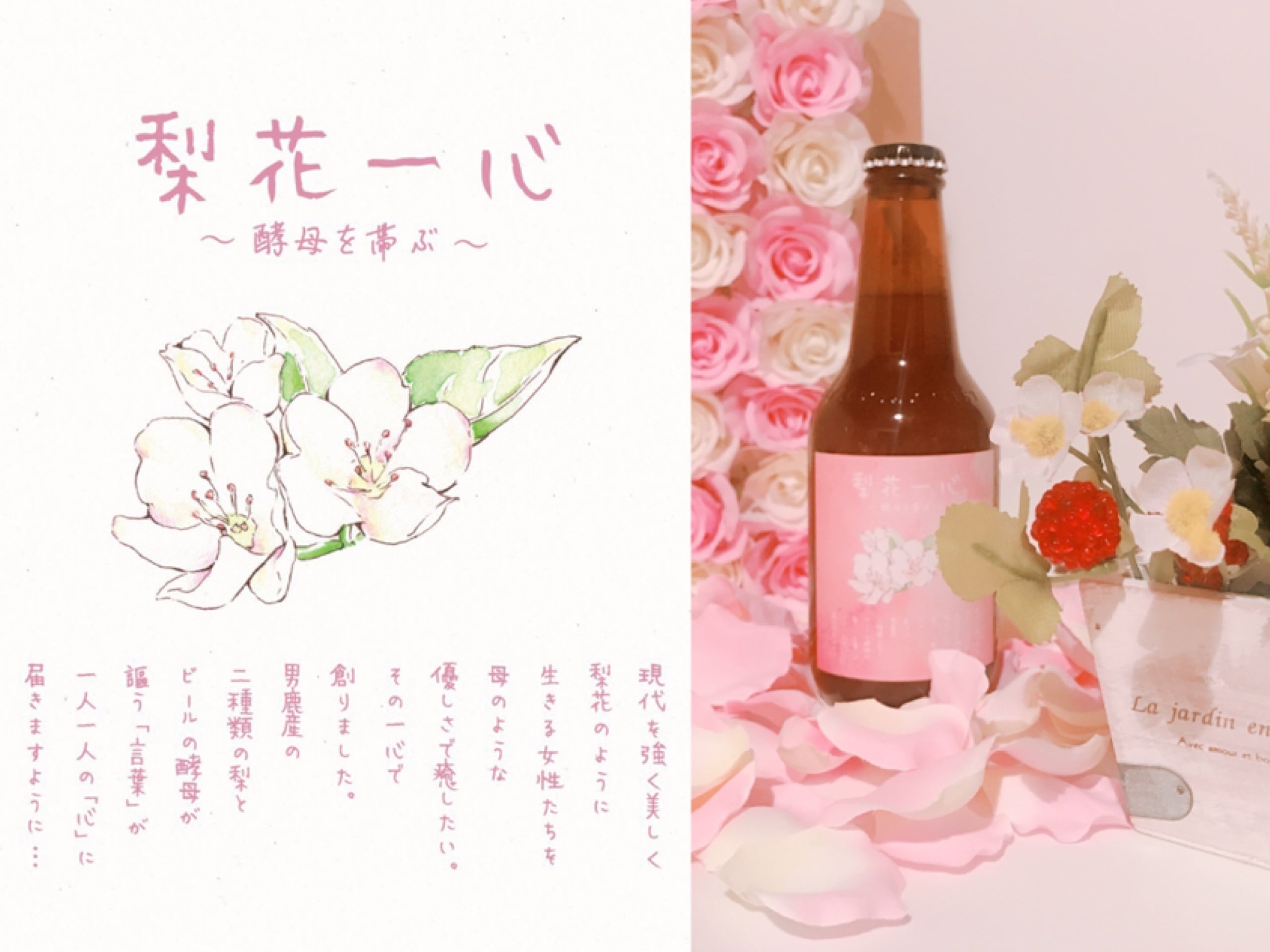 ビールの名前には、「梨の花のように美しく生きる女性たちにへ、癒しを与えられますように。」という想いが込められています。