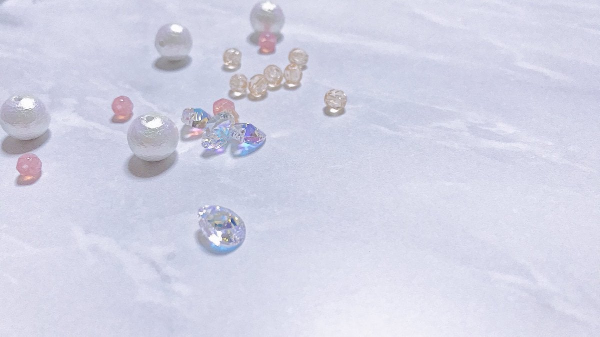 梨花のように白く艶のあるパール、ゆるみな。さんの原点である「‘‘桃’’ビール」のピンク、梨の瑞々しさを感じさせる透きとおった黄色。そして、幾度もこぼしてきた涙型のクリスタル。ベースパーツには、『梨花一心』のビールを思い出させるゴールドのみを使用。