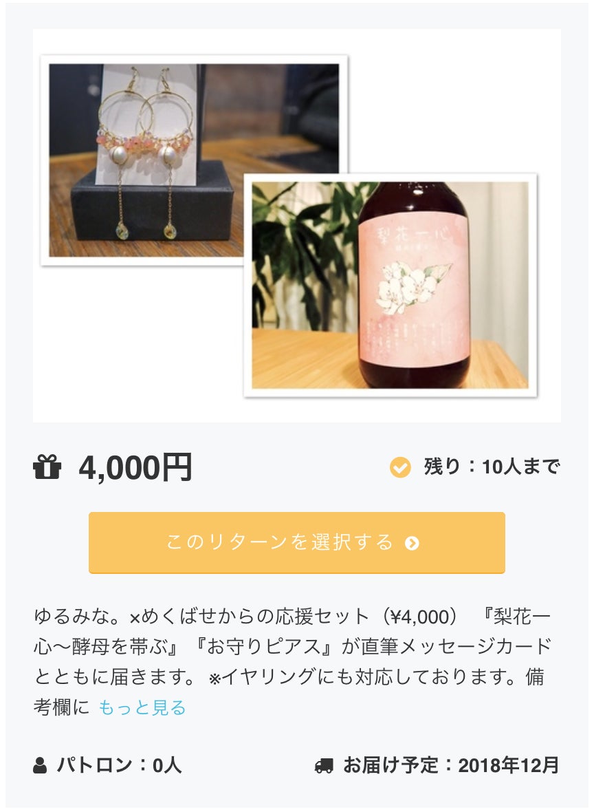 新たに、「梨花一心~酵母を帯ぶ」をイメージして作られたハンドメイドピアス(イヤリング)のリターンを設けました♩