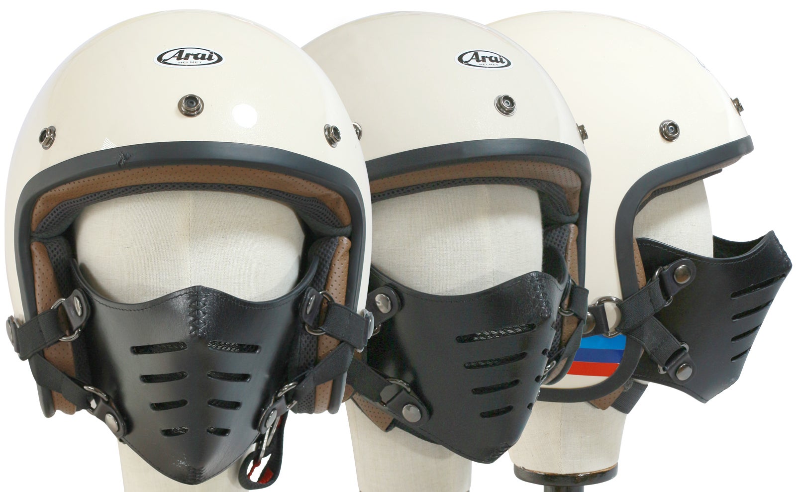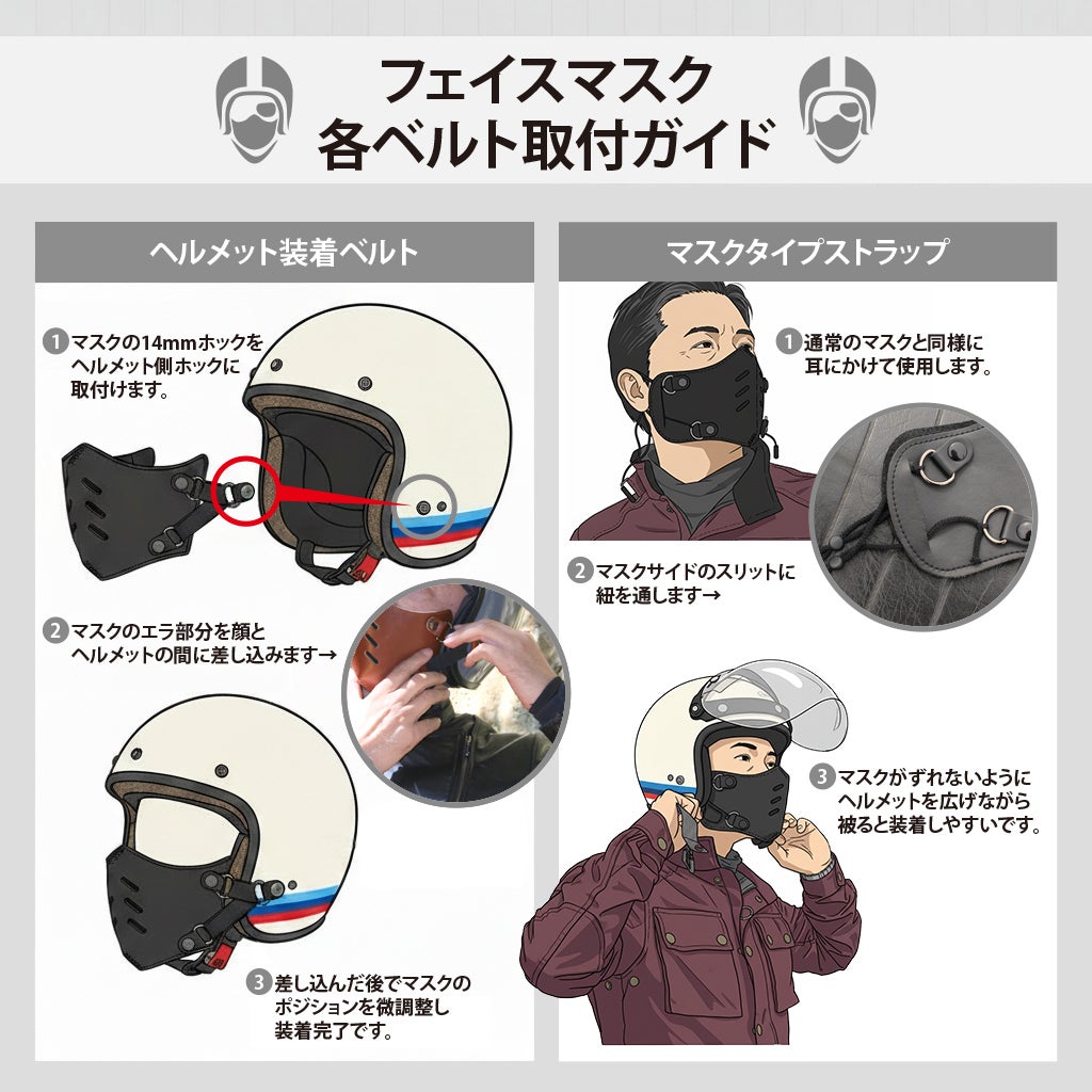 ジェットヘルメットのサイドホックに取り付けることでマスクを装着できます。マスクのエラ部分は頬とヘルメットの間に差し込みます。フローティング方式のゴムベルトで顔へのフィット感が調整できます。