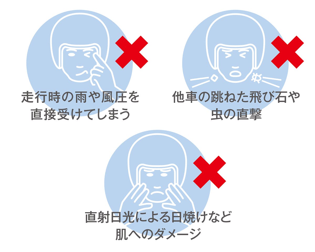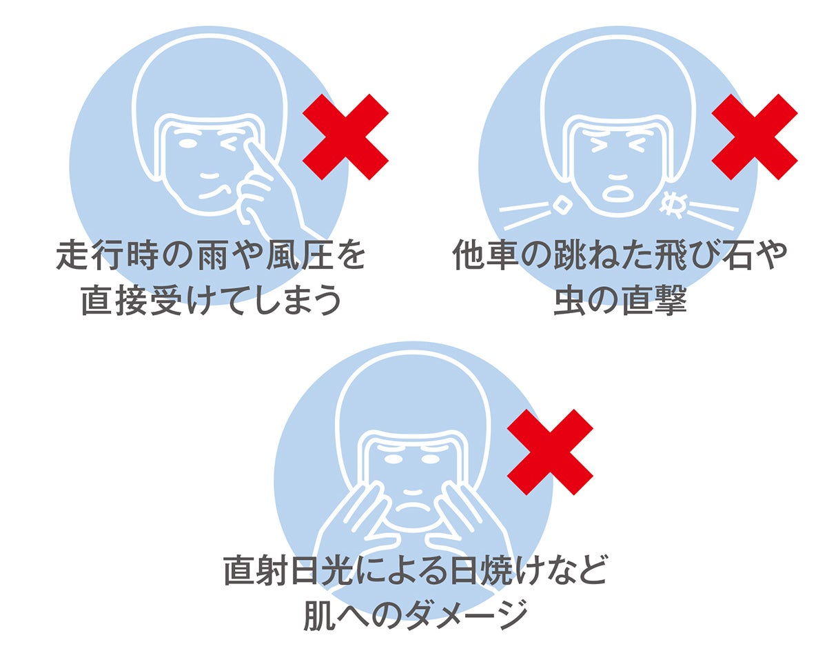 冷たい風で鼻や頬が痛い。走行中に小さな飛び石が当たってヒヤッとする。小さな虫が顔に当たって痛い。さらに日差しが強い日は、直射日光で顔まわりがジリジリする。