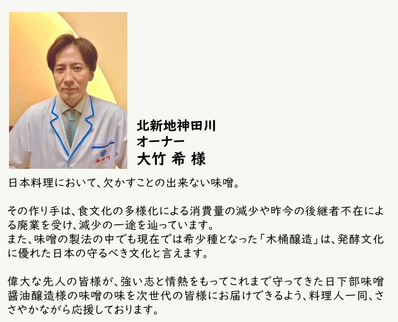 2026/04/18 21:45この度、大阪・北新地の名店 神田川本店 のオーナーである 大竹希 様より、クラウドファンディングへの温かい応援メッセージを頂戴いたしました。「神田川」は、日本料理界の名匠である 神田川俊郎 様(本名:大竹俊郎様)が築き上げた、日本料理の伝統と革新を体現するブランドです。テレビや書籍を通じて広く親しまれた神田川俊郎様は、「料理は愛情」を信念に、日本料理の魅力を全国へ発信し続けてこられました。現在はその志を受け継ぎ、息子である大竹希様が「神田川」を牽引されています。伝統の技を守りながらも、新たな感性と表現で日本料理に革新をもたらし、次の時代へとその価値を繋いでおられます。実は、「神田川」様のお料理には、当蔵の味噌「錦秋」をご使用いただいております。この「錦秋」は、大寒に仕込み、秋に掘り出す、一年に一度しか仕込まれない最上級の十割こうじ味噌です。四季を越えてじっくりと熟成された、深みと奥行きのある味わいが特徴です。さらに、神田川俊郎様、そして「神田川」を特集したドキュメント番組の中でも、この「錦秋」や朴葉、そして私たち日下部味噌醤油醸造の取り組みをご紹介いただきました。岐阜県高山という地域を越え、日本を代表する料理人の現場で私たちの味噌が活かされていることは、大きな誇りであり、同時にその責任の重さも感じております。私たちはこれからも、こだわり抜いた味噌と醤油を「歴史」「伝統」「文化」という形で未来へ繋いでいきたいと考えています。クラウドファンディングも、いよいよ残り12日となりました。ここからが最後の踏ん張りどころです。必ず次へと繋がる挑戦にしてまいりますので、引き続きのご応援とご支援を、何卒よろしくお願い申し上げます! もっと見る