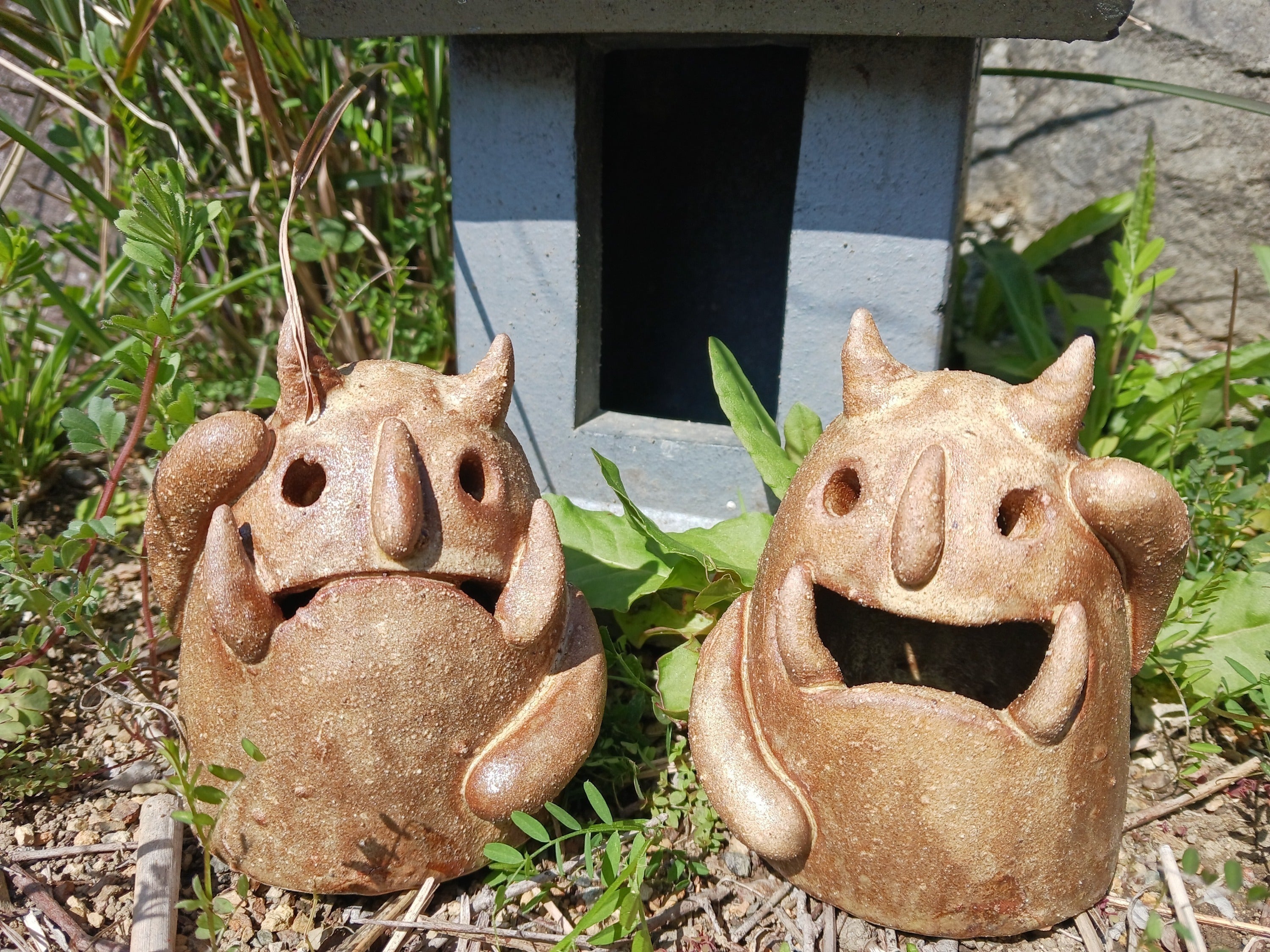 【おにわ阿吽セット】鬼のハニワ『おにわ』の阿吽を2体ひと組のセットにして提供します。 愛媛県鬼北町の原土を使っています 表情やポーズはみんな異なりますので、どんな子が届くかお楽しみに♪ ・数量:1点(2体ひと組) ・サイズ:約12cm(個体差があります)