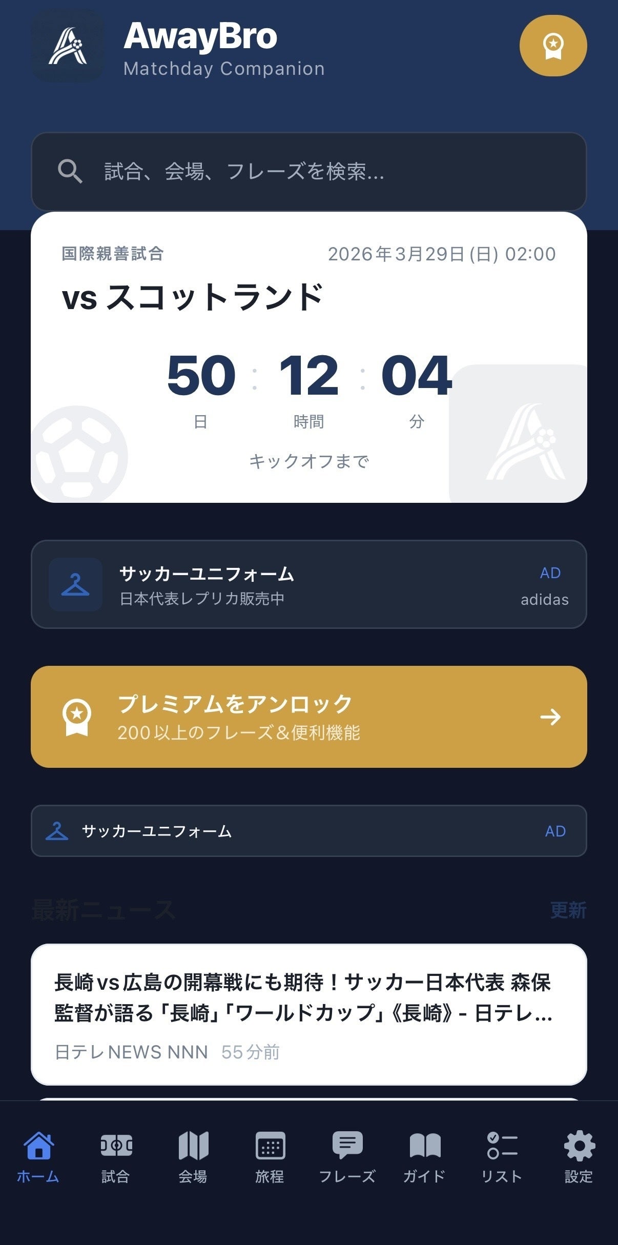AwayBroは、W杯2026を現地観戦する日本人サポーターのための「旅の相棒」アプリです。