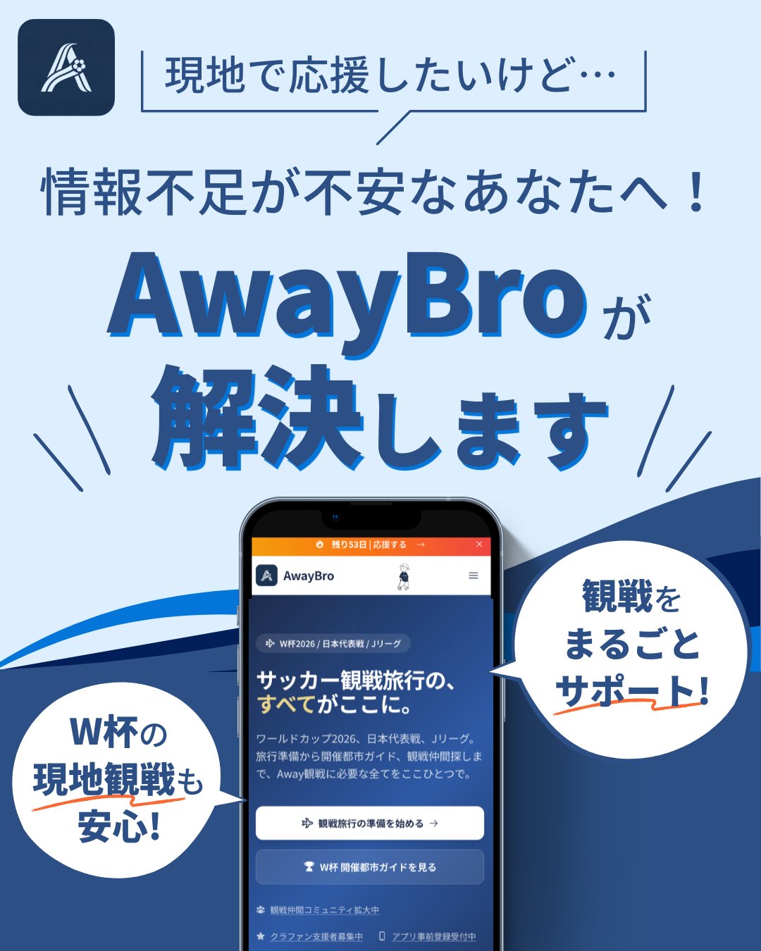 2026/03/13 07:09皆様、サポートありがとうございます。おかげさまで3/9に無事、AwayBro WEB版をリリースすることができました。ここから機能充実、アプリリリースまで加速していきます。今後とも宜しくお願いします。GSの現地特設ガイドページ、Jリーグの遠征ページも作りました!ぜひご覧ください。https://awaybro.com/dallas-guide もっと見る