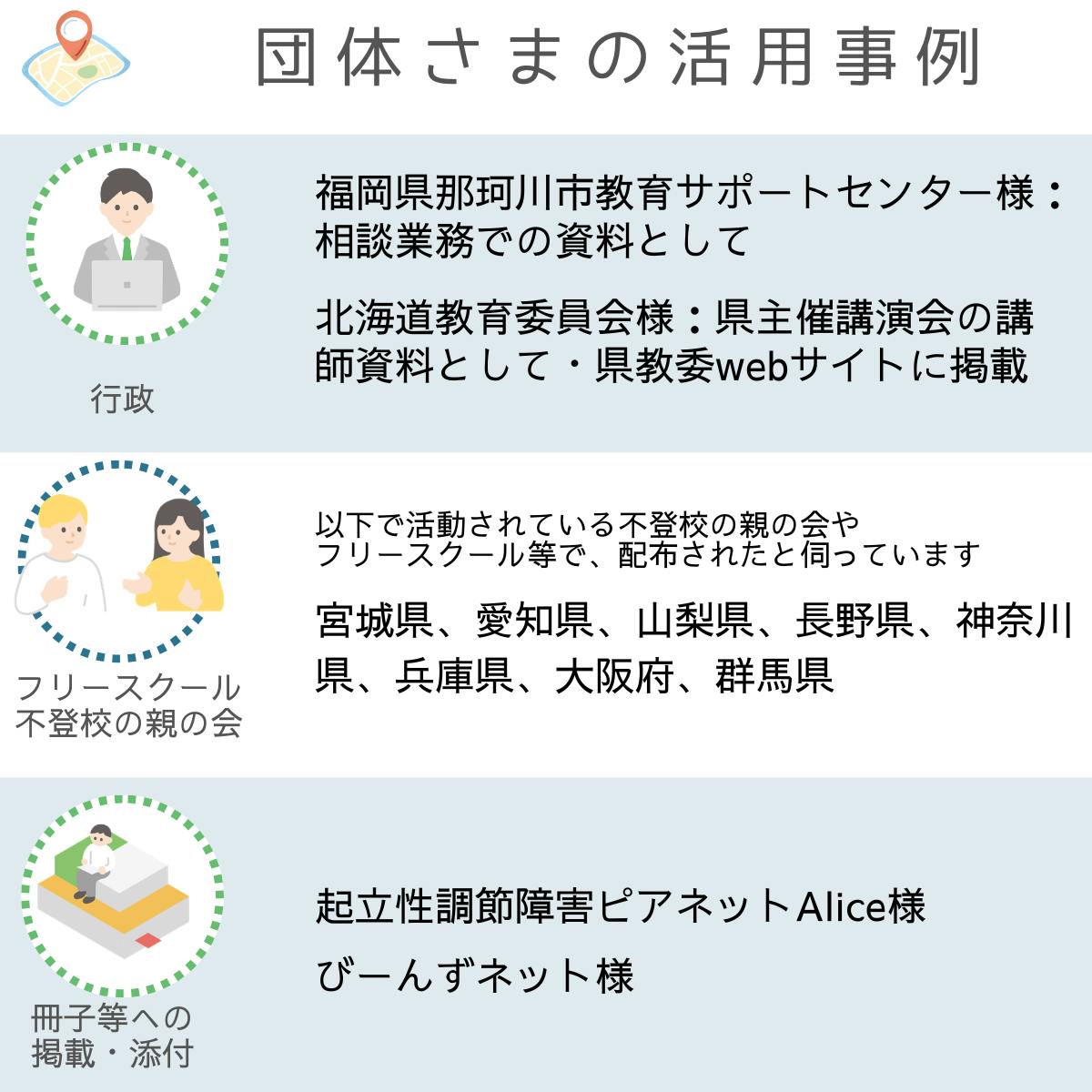 保護者さんたちだけではありません。行政や、日本各地にある不登校親の会、フリースクールなど不登校支援をされている団体さま等、広くご活用いただいております。