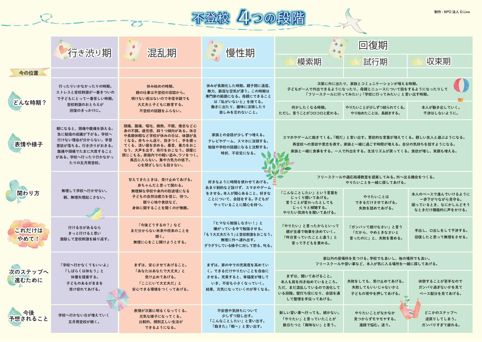 これらは、不登校に悩む保護者さんのコンパスにしてほしいと願って制作しました。不登校の段階表は、多くの保護者さんに活用してほしいので、私たちのホームページ等から無料でダウンロードしていただけます。