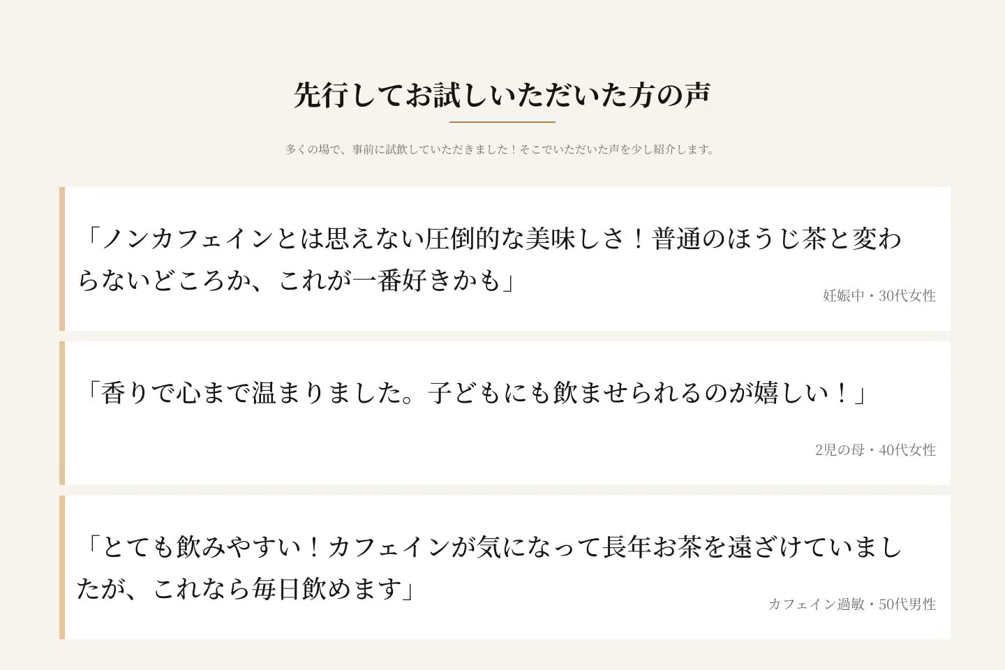 私自身、妊娠・授乳期間中にカフェインが理由でお茶やコーヒーが楽しめなかったという経験があるので、デカフェ日本茶というプロジェクトにはものすごく共感します。