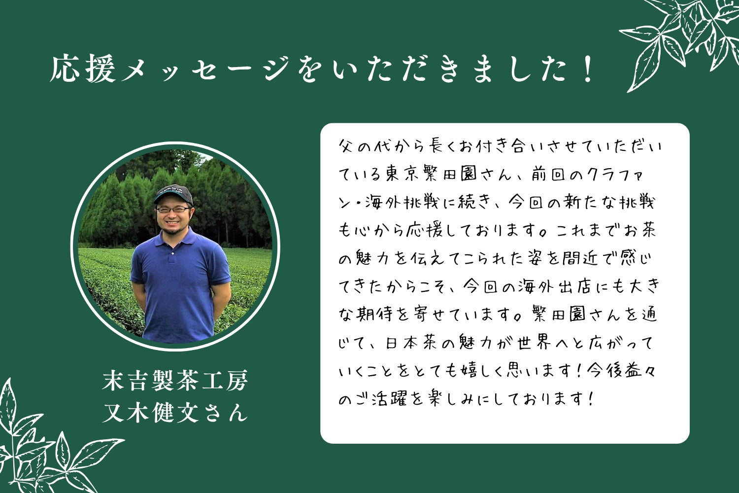 応援メッセージ第8弾は、鹿児島県曽於市の生産者さん・末吉製茶工房の又木健文さんです!