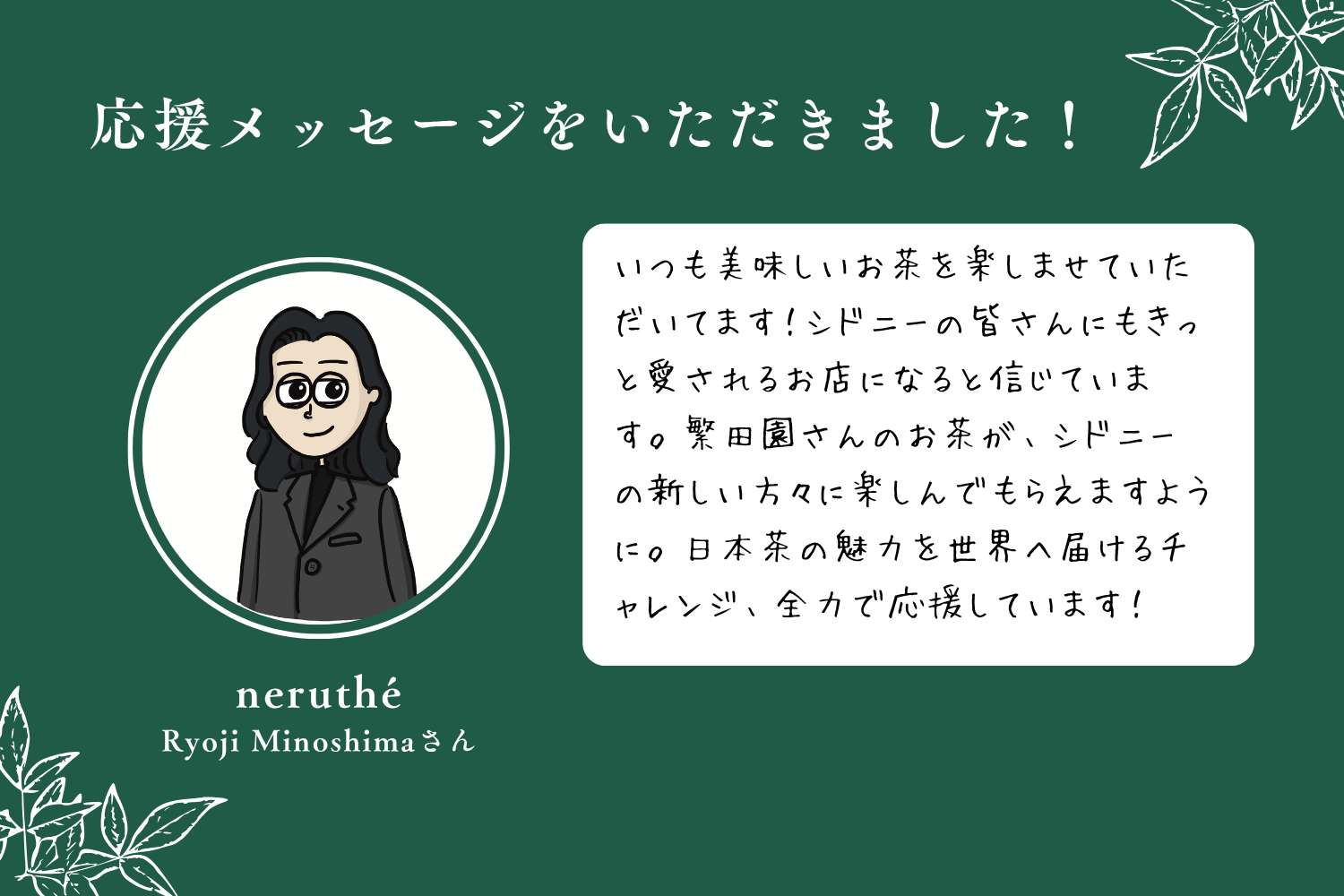 2026/04/08 08:00おはようございます!東京繁田園茶舗のまりこです。プロジェクト公開から20日が経ち、終了まであと【12日】となりました!シドニーでは、物件の契約締結が佳境に入り、まもなく皆さまに店舗の詳細をお伝えすることができそうです。クラウドファンディングも4/20(月)の終了に向けてラストスパートに入っていきたいと思いますので、皆さまいましばらくお付き合いいただけましたら幸いです◎--とういうことで本日も、いただいた応援メッセージをご紹介してまいります!応援メッセージ第8弾は、鹿児島県曽於市の生産者さん・末吉製茶工房の又木健文さんです!お父様の代から長年にわたってお取引させていただいている末吉製茶工房さん。私も大好きな「はんだ誉」や「特撰濃いみどり」の主原料となるお茶を生産いただいています。末吉製茶工場さんが畑を構える都城地域は、とても歴史ある茶生産地です。1751年、高級茶産地の代名詞だった京都・宇治と都城の地理的・気候的条件が非常に似通っていることに、都城島津藩士の池田貞記が目をつけ、宇治の製法を学んで、都城で広めたのがはじまりと言われています。1757年には、時の桃園天皇にお茶を献上するほどの名声を得ました。そんな歴史と栄誉ある茶生産地で、茶農家の三代目に生まれた又木健文さんは、大学卒業後は公認会計士として監査法人事務所に勤務されていた元バリバリのビジネスパーソン。充実した社会人生活を送られていた一方で、「考えてみたら、父親と一緒にお茶をつくれる時間はそんなに長くない。ふとそう思ったんでよね」と一大決心、数年前に茶農家に転身されました。私たちが又木さんから感銘を受けるのは、そのどこまでも真摯なお茶づくりに対する姿勢。「300年続けられる茶農家になりたい」「本当に美味しいお茶を作りたい」「そのお茶を、自分の手でもお客様へ届けたい」そうしたお茶づくりに対する想いは、しっかりと品質に反映されており、「Great Taste Awards」、「JAPANESE TEA SELECTION PARIS」といった海外コンテストで、最高三つ星や最優秀賞を含む多くの賞を受賞されています。手間暇かけてつくりあげられた素晴らしいお茶を、お客様にお届けできること。私たちの新しい取り組みを応援していただけること。改めて、とても恵まれていることだと感じます。本当に、どうもありがとうございます。そんな又木健文さんからいただいた応援メッセージをご紹介させていただきます!ウェブサイト&SNSはこちら♪▼末吉製茶工房HPhttps://www.sueyoshiseichakobo.co.jp▼末吉製茶工房オンラインショップhttps://ochawa26gu.sueyoshiseichakobo.co.jp▼末吉製茶工房 Instagram: @sueyoshiseichakobohttps://www.instagram.com/sueyoshiseichakobo--そして、末吉製茶工房さんより、ビッグニュース!!一年に一度、この時期だけ募集をする「茶畑オーナー2026」のお申込みが本日より始まりました!!末吉製茶工房さんの茶畑1坪オーナーになれちゃうこのサービス。コースによって、春夏秋冬の「季節に合わせたお茶」や小物、便利な道具等が届いたり、オーナー特典として、オンラインショップで何度でも使える【10%OFFクーポン】がもらえます。たとえば「春&夏&秋&冬にお届けコース」を申し込むと、、【春にお届けする内容】(5月下旬頃 発送予定)・新茶 飲み比べセット 50g ✕ 3種類・オーナー証明書【夏にお届けする内容】(8月上旬頃 発送予定)・水出し煎茶 40g・水出しほうじ茶 35g・水出し緑茶ティーバッグ 15包・末吉製茶工房ロゴ入り「急須ボトル」(300ml) 1本【秋にお届けする内容】(11月下旬頃 発送予定)・青ほうじ茶 100g・玄米茶 50g・季節のお茶(お楽しみセレクト)・お茶の『種』【冬にお届けする内容】(2月下旬頃 発送予定)・冬の蔵出し熟成茶 飲み比べセット 50g ✕ 3種類1年間でこれだけのお茶とアイテムが茶農家さんから直接届くそう。これは、日本茶ファンにはたまらないサービス…!限定300坪、お申し込み締め切りは5/31。気になる方はぜひ、下記ページにて詳細ご確認ください!!▼茶畑オーナー2026 お申込みページhttps://ochawa26gu.sueyoshiseichakobo.co.jp/categories/3697583--4月8日4:30現在、180名の方に1,767,750円のご支援をいただいております。たくさんの温かいご支援、誠にありがとうございます!終了まであと12日。目標金額300万円の達成に向けて、最後まで頑張っていきたいと思いますので、引き続き温かく見守っていただけましたら幸いです。また、もしお近くに日本茶好きの方やこのプロジェクトに興味を持ってくださいそうな方がいらっしゃいましたら、ぜひクラウドファンディングページをシェアいただけましたら嬉しいです。できるだけ多くの人にこのプロジェクトについて知っていただくことで、新たなコラボレーションが生まれ、日本茶業界を盛り上げていきたいと思っております。何卒、皆様のお力をお貸しいただけましたら幸いです。それでは、本日も素敵な1日をお過ごしください♪ もっと見る