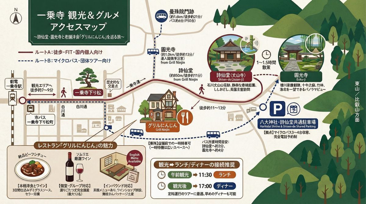 詩仙堂など周辺観光地と組み合わせた来店動線を明確化します。
