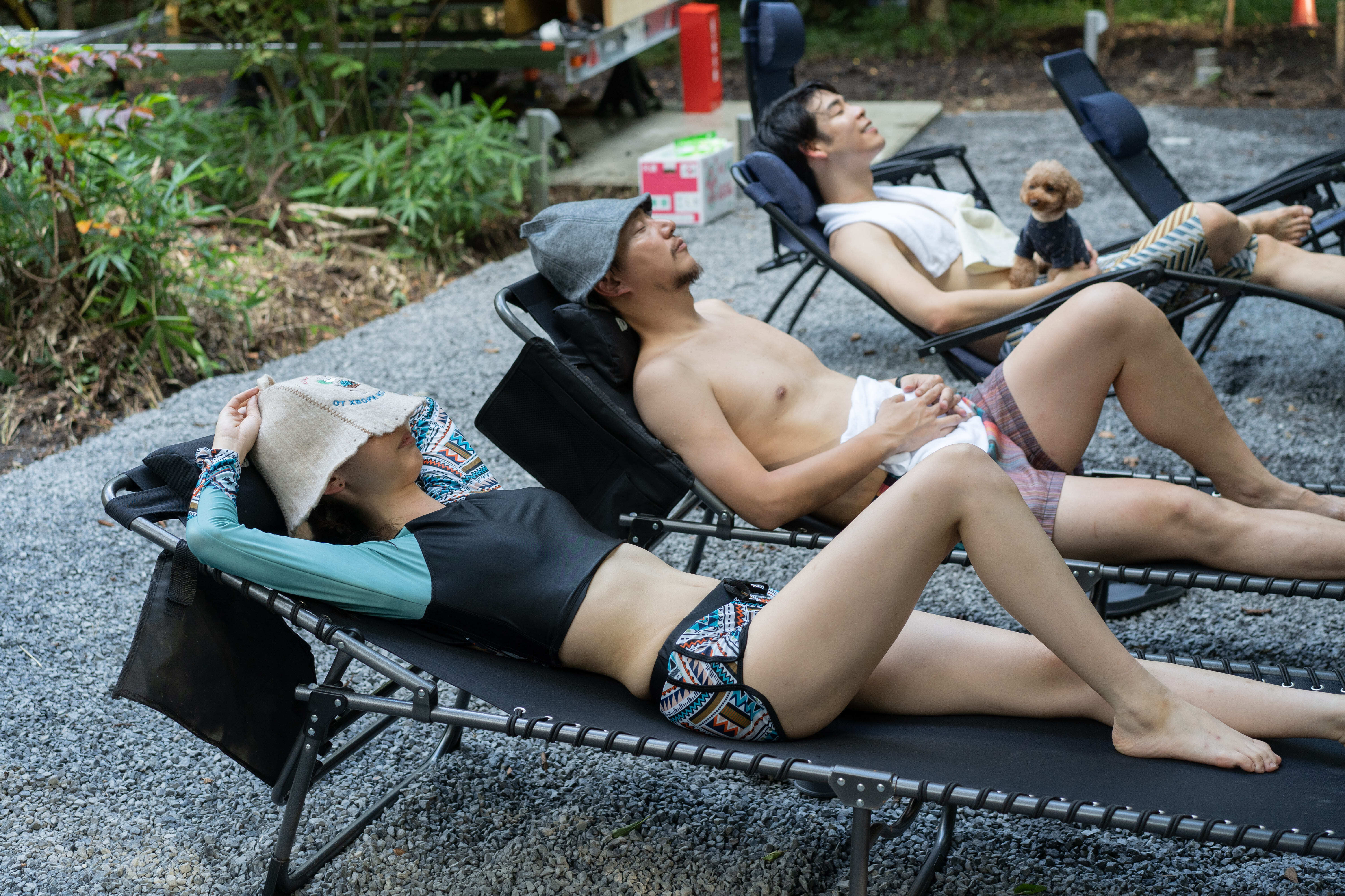 サウナで整ったあとに外気浴を楽しみ、焚き火を囲み、那須の澄んだ空気の中で過ごす。