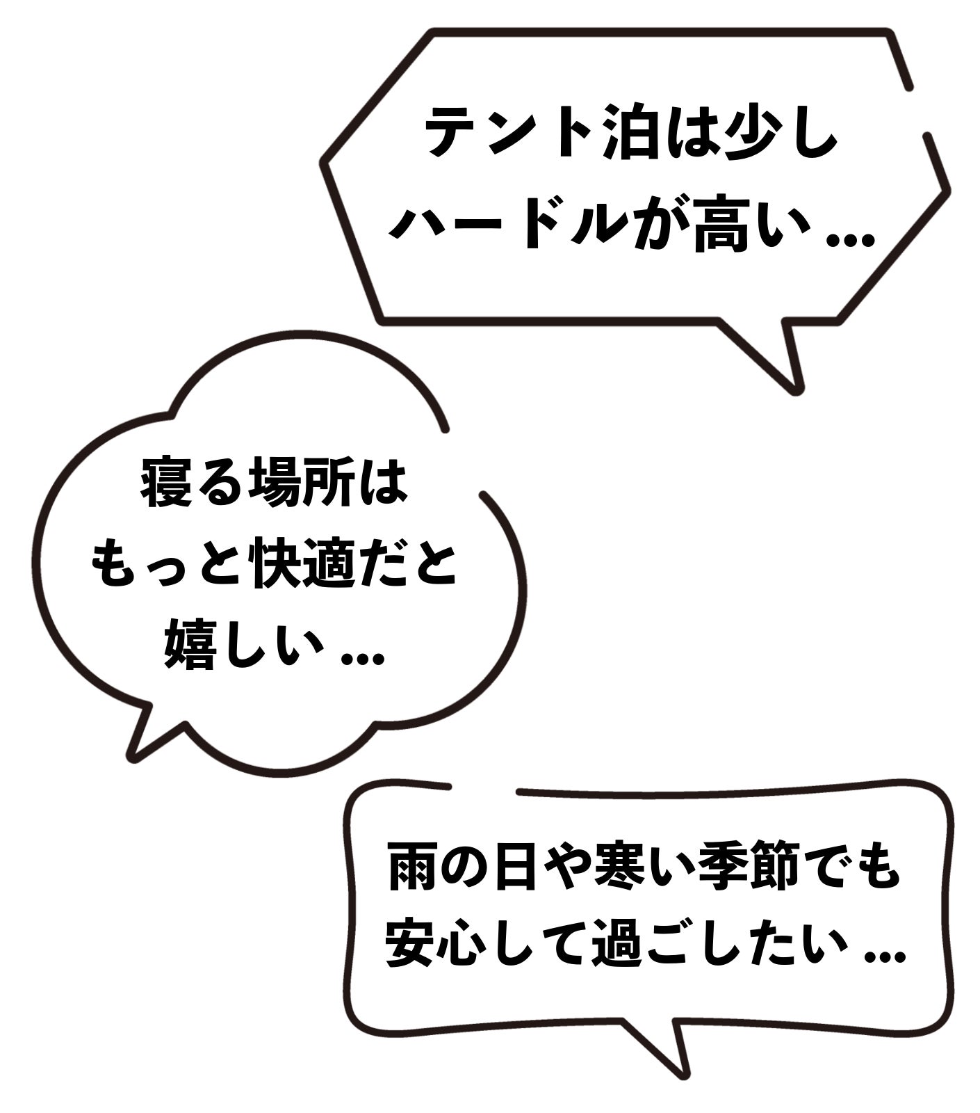 一方で、これまでの宿泊スタイルはテント泊が中心だったため、キャンプに慣れている方には魅力がある反面、初心者の方や悪天候の日、寒い季節には少しハードルの高い面もありました。