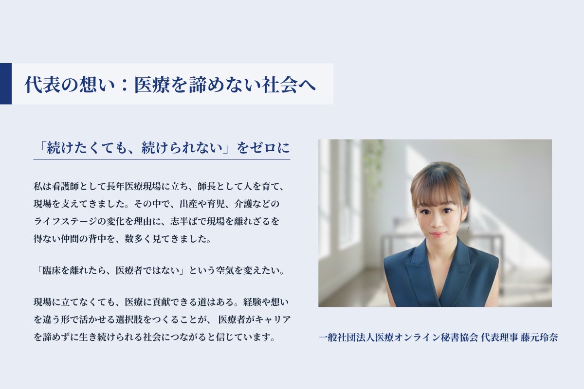 「医療を支える『裏側の仕事』を、社会の基盤として整えていく大切な取り組みだと思います。いつもオンライン秘書さんたちに助けられております。新しいチャレンジ、応援しております!がんばってください!」