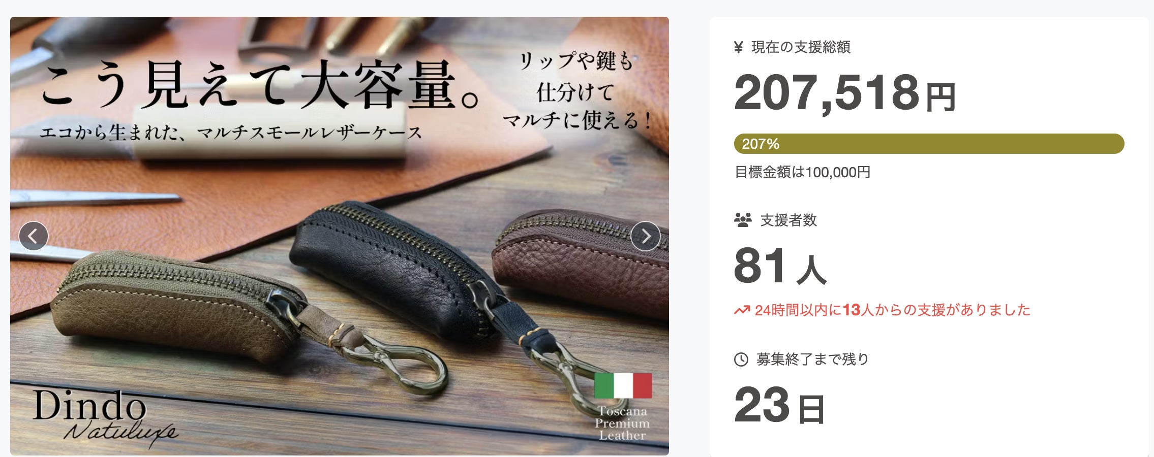2026/04/07 16:26実行者のINCROCI MILANOです。現在実施中のプロジェクト"Dindo Natuluxe" は、皆様からのたくさんのご支援をいただき、目標を200%達成いたしました!!たくさんのご支援、誠にありがとうございます!Dindoは、・制作時にどうしても出てしまう端革を、簡単に捨てるのではなく、もう一度長く愛せる商品として生まれ変わらせること・手頃な価格で、レザーを育てる愉しみを味わって欲しいという思いを込めたプロジェクトです。レザーほど長く愛せてサステナブルな素材はなかなかありません。このDindoというプロジェクトを通じて、レザーという素材の素晴らしさを少しでも多くの皆様に伝えていきたいと思っています。引き続きのご支援のほど、どうぞよろしくお願いいたします。INCROCI MILANO もっと見る