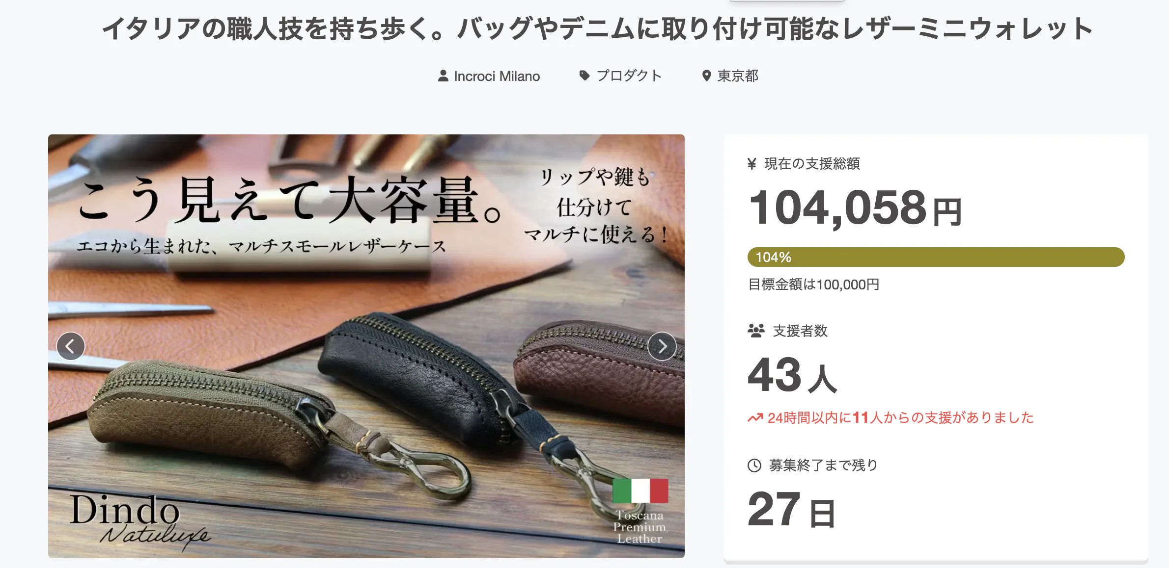 2026/04/07 16:26実行者のINCROCI MILANOです。現在実施中のプロジェクト"Dindo Natuluxe" は、皆様からのたくさんのご支援をいただき、目標を200%達成いたしました!!たくさんのご支援、誠にありがとうございます!Dindoは、・制作時にどうしても出てしまう端革を、簡単に捨てるのではなく、もう一度長く愛せる商品として生まれ変わらせること・手頃な価格で、レザーを育てる愉しみを味わって欲しいという思いを込めたプロジェクトです。レザーほど長く愛せてサステナブルな素材はなかなかありません。このDindoというプロジェクトを通じて、レザーという素材の素晴らしさを少しでも多くの皆様に伝えていきたいと思っています。引き続きのご支援のほど、どうぞよろしくお願いいたします。INCROCI MILANO もっと見る