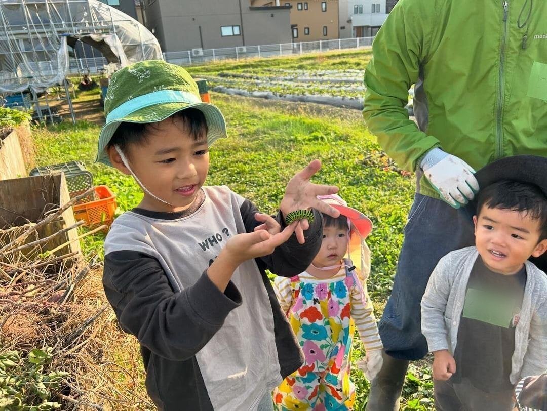 (アゲハ蝶の幼虫を発見!畑には生き物がいっぱいです。)