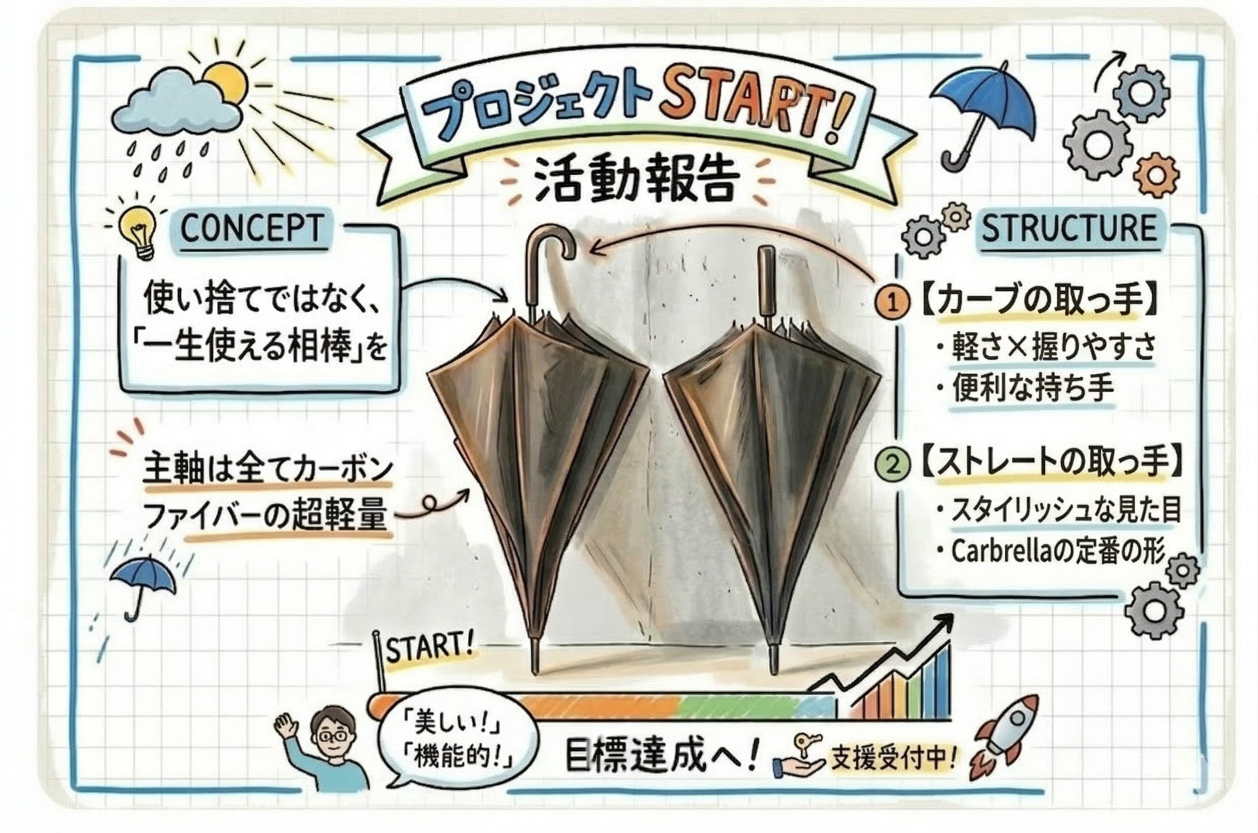 本日、一生モノの超軽量・ワイド傘『Carbrella(カーブレラ)』プロジェクトが、ついにスタートいたしました!