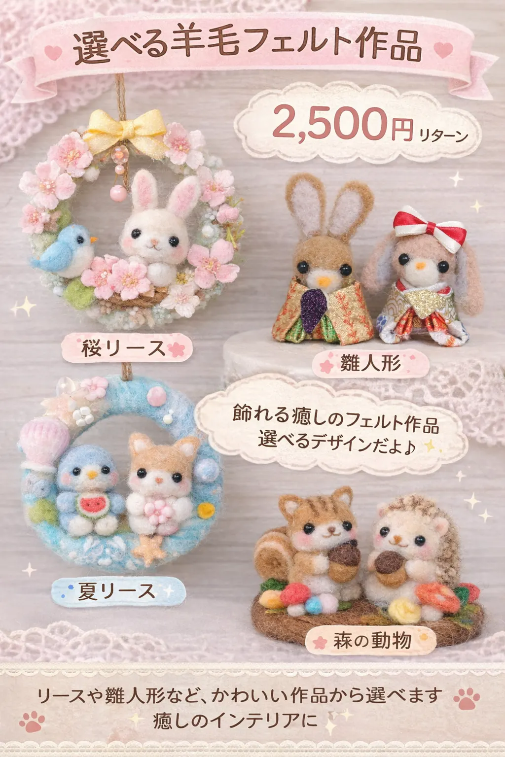 そんなあなたのために、今日は自信を持ってお届けする、とってもお得で可愛い**「2,500円の選べる羊毛フェルト作品リターン」**をご紹介します!