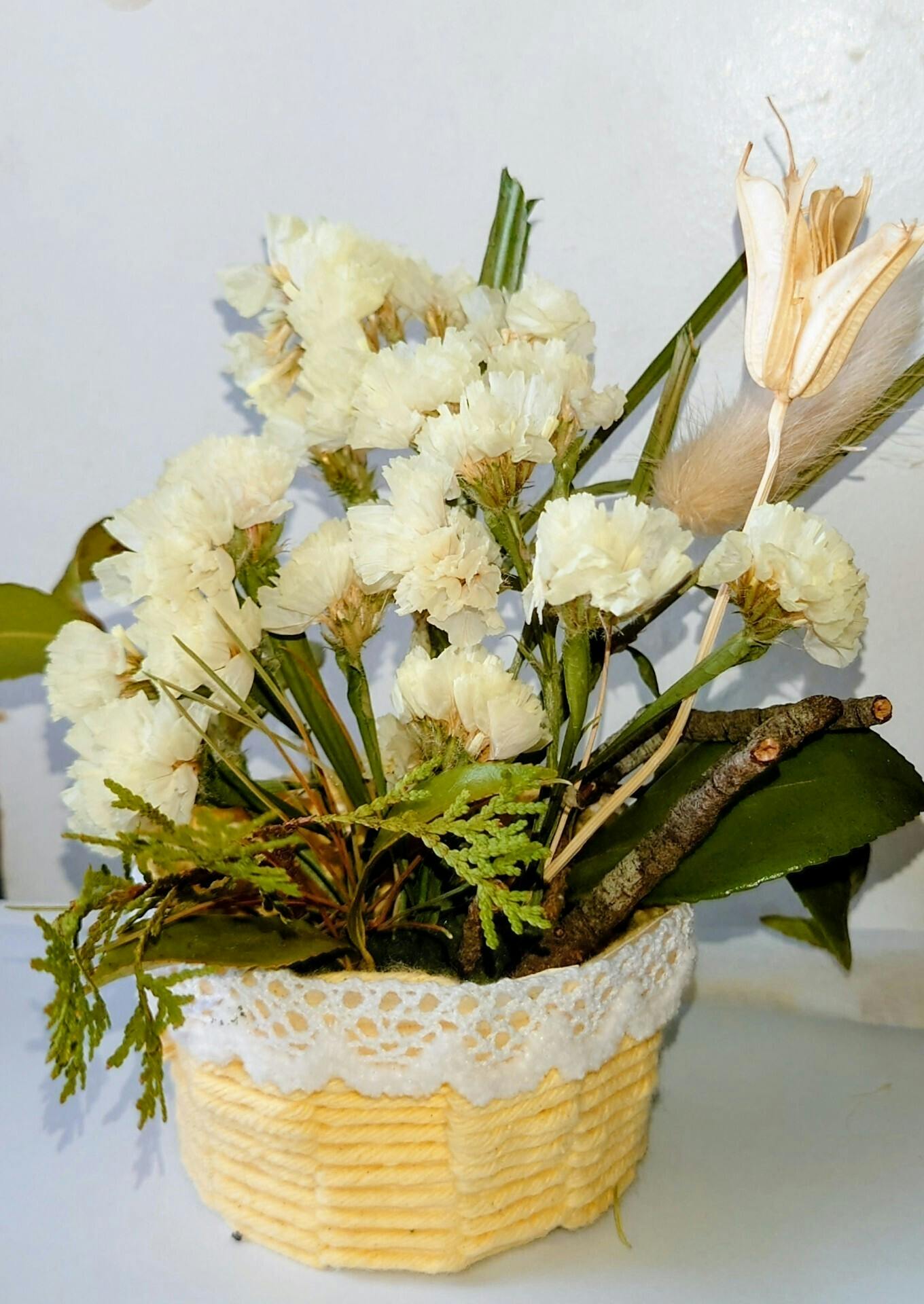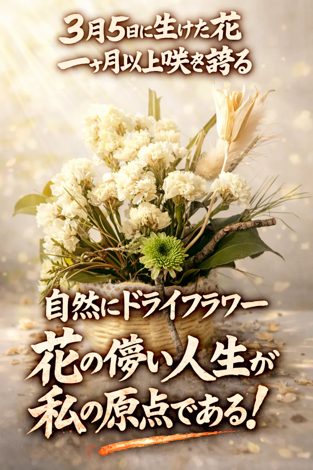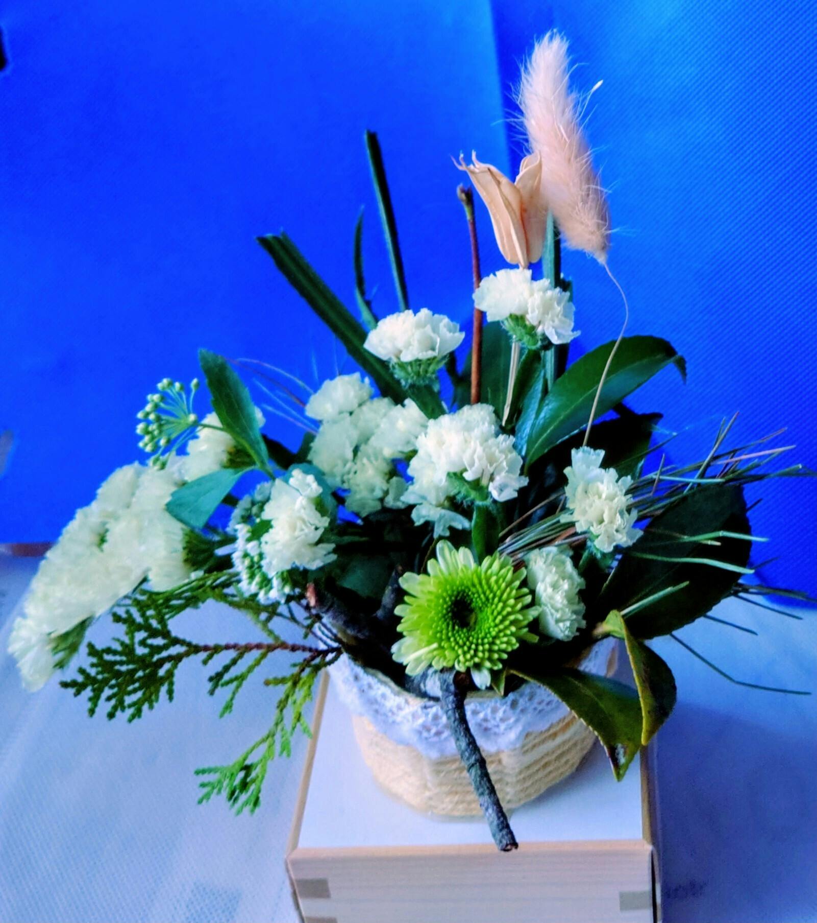 一ヶ月近く経ち、お花の種類によっては枯れてしまったものもあります。ですが、松の力強い緑や、形を保ったまま静かに「ドライフラワー」へと姿を変えつつある花たちが、今もなお凛とした佇まいでそこにいます。
