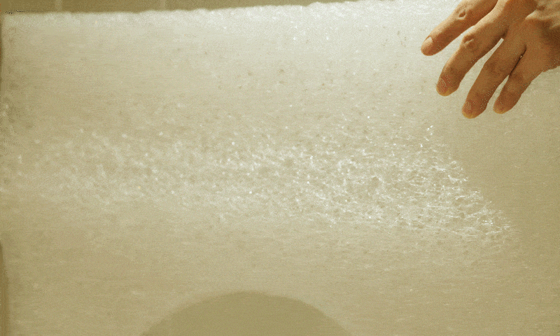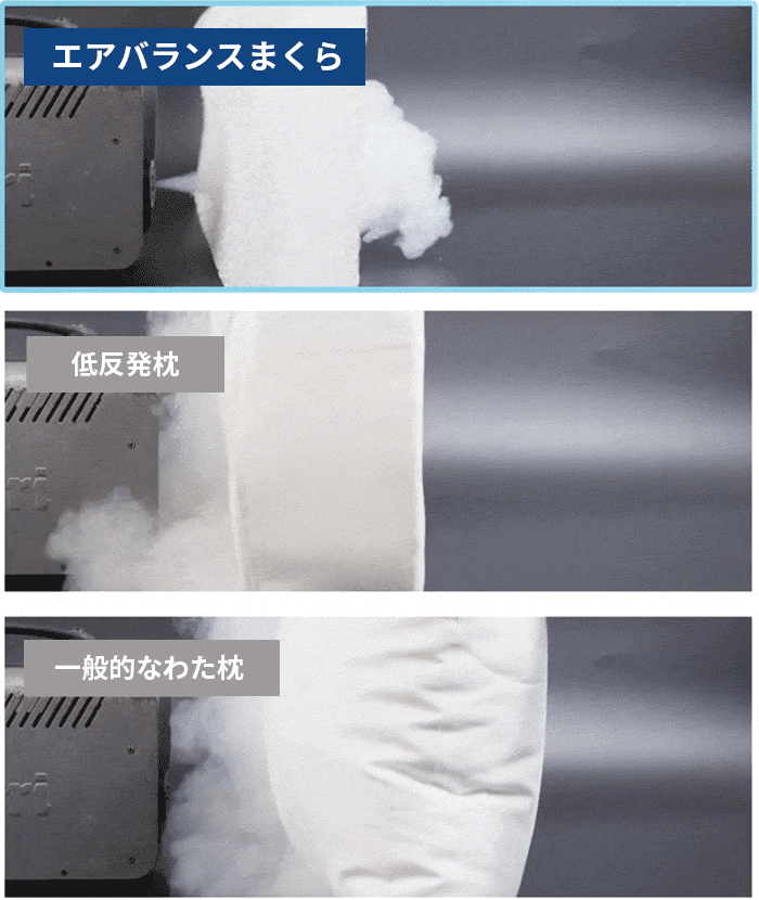 一般的な枕と比較した通気デモでは、空気の通り抜け方の違いが明確に。構造そのものが、快適性を支えています。