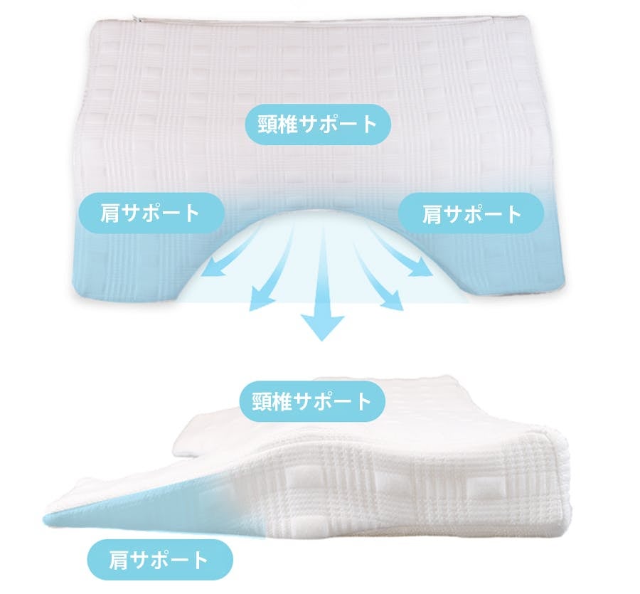 肩は体の中でも特に出っ張った関節のひとつ。一般的な枕では肩が体重で押されやすく、その影響が首へと伝わりやすいためです。
