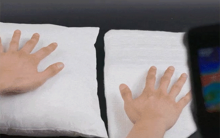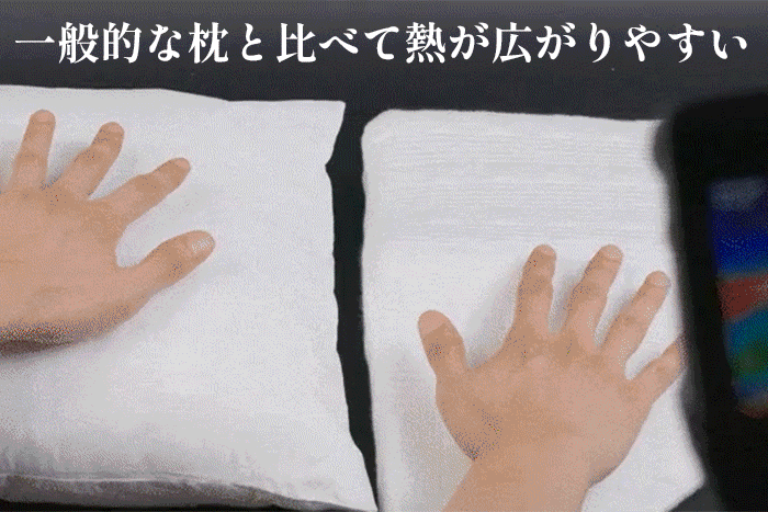 また、接触前後の表面温度比較テストにより、一般的な枕と比べて熱が広がりやすい設計であることを確認しています。