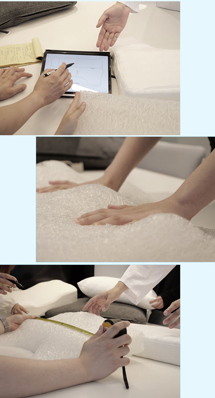 これまで20年以上にわたり、頸椎枕・脊椎枕・脚枕など、体のラインを考慮した機能性枕を開発してきました。