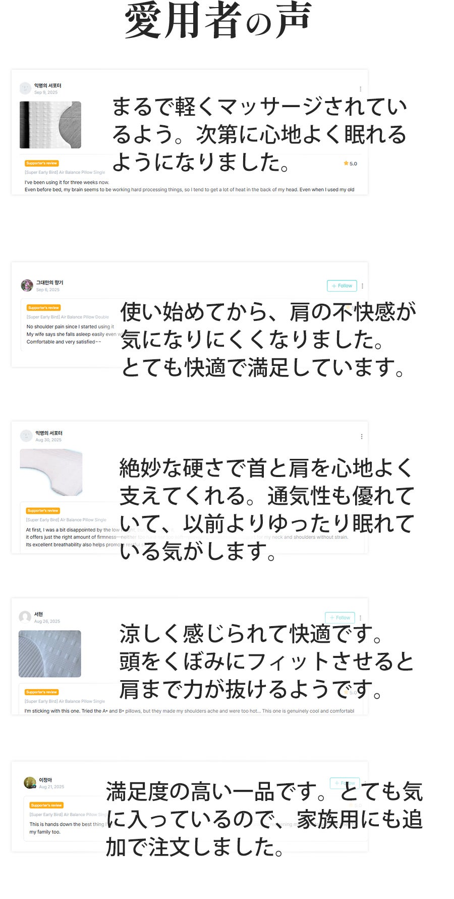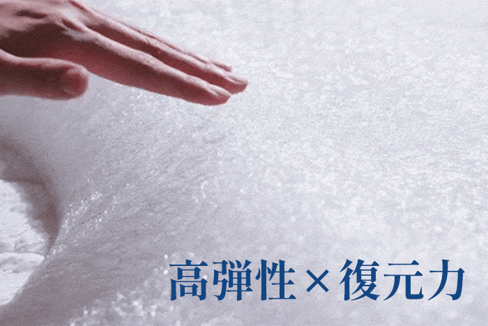 密度と復元力を兼ね備えたエアバランス素材が、荷重を受け止めながらすばやく元の形へ戻ります。長く使っても変わりにくい支え方で、寝姿勢を安定させます。