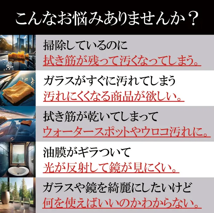 場所を選ばず手軽に使用でき、その効果をすぐに実感いただけるガラスクリーナーです!