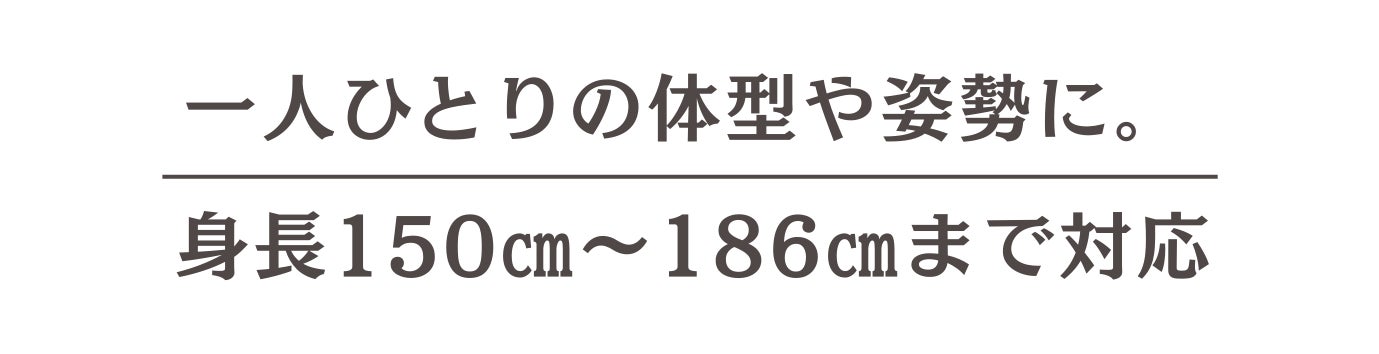 ・小柄な女性も大柄な男性も、まるで「自分専用」の座り心地へ。身長150cm〜186cmの幅広い体型に対応し、誰が座っても背中と腰にピタッと吸い付きます。