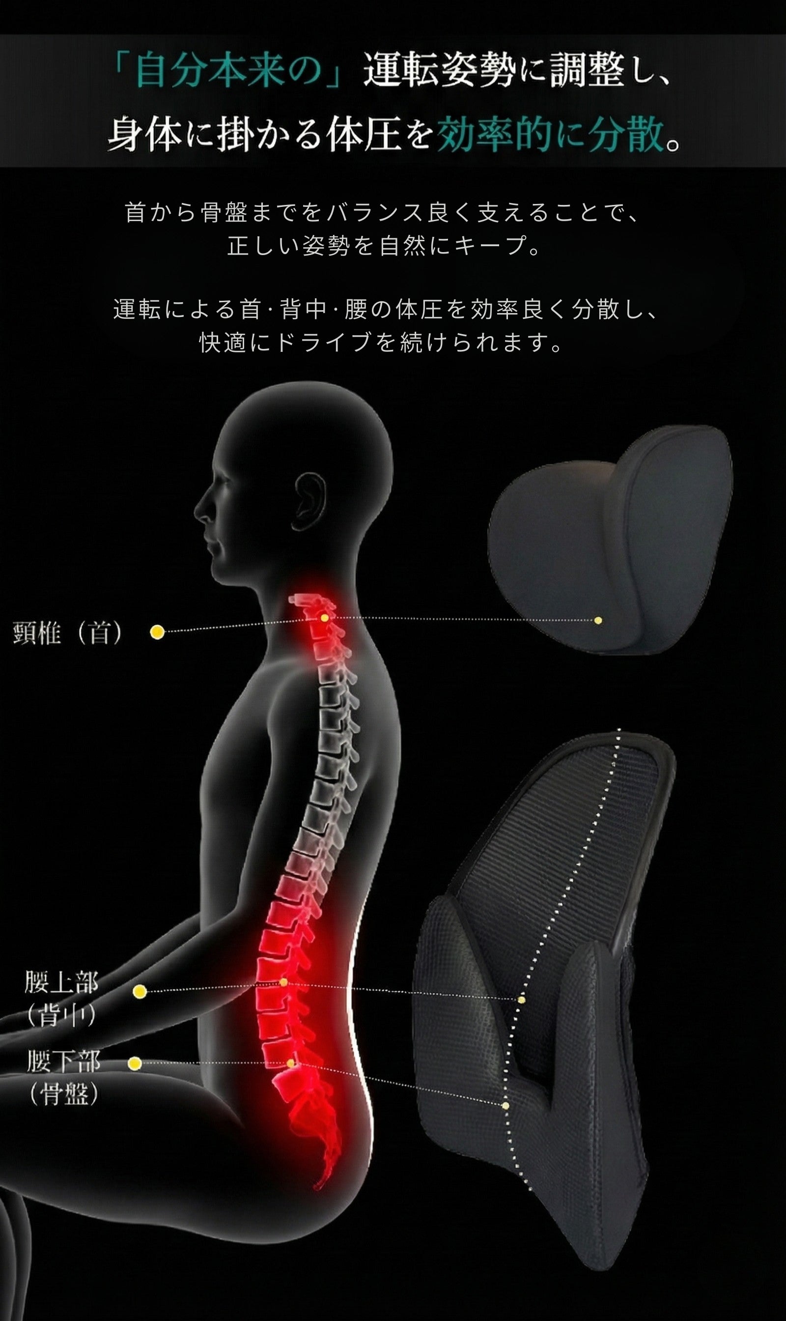 長時間の運転でも姿勢が崩れず、全身の負担をサポート!